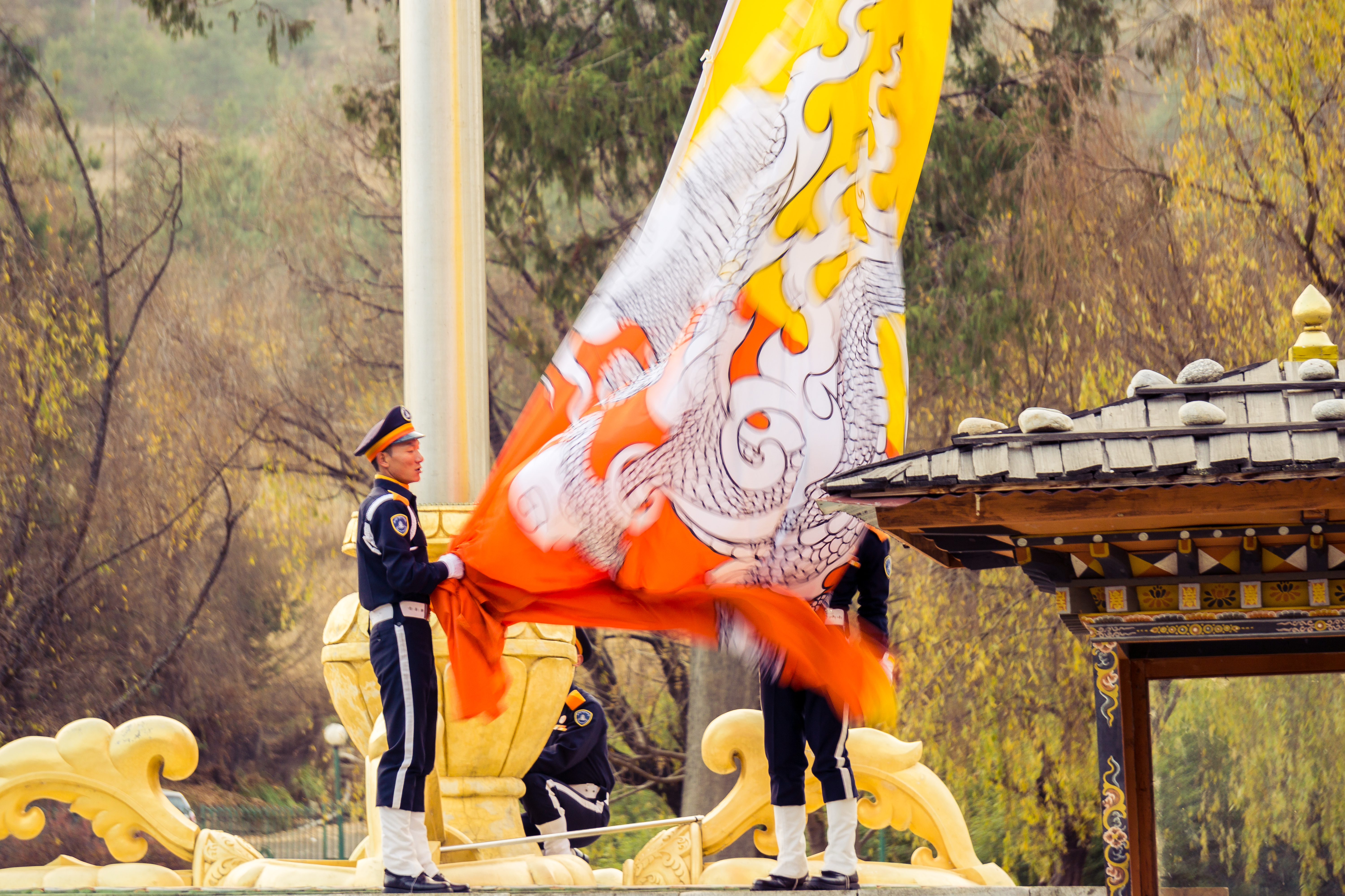 부탄의 국장은 두 마리의 용이 여의주를 쥐고 있는 형상으로, 불교 국가인 부탄의 종교적 특성과 왕권을 상징한다. - 부탄의 상징 - 부탄의 국가