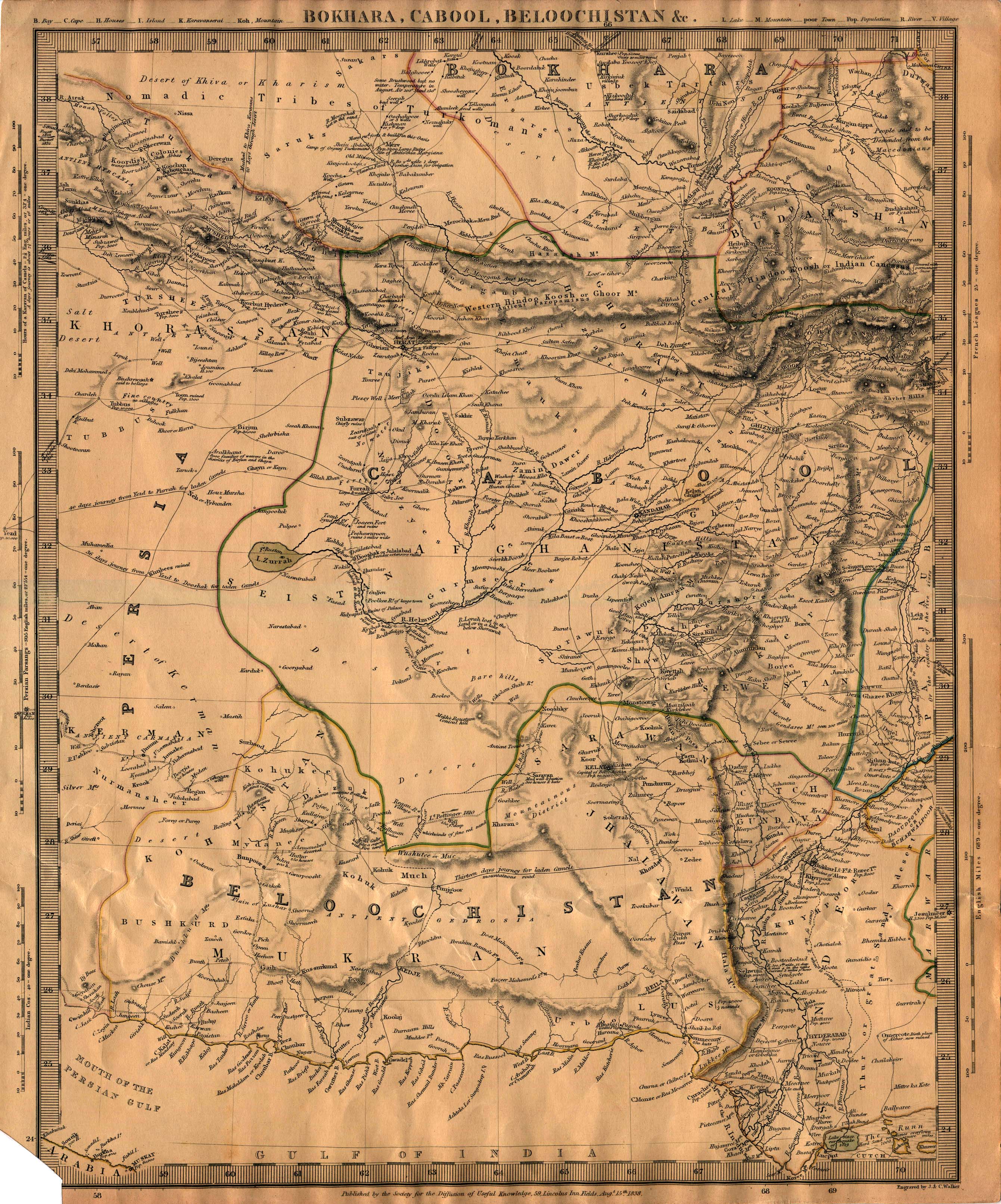 부하라 토후국(꼭대기), 카불(중앙)과 발루치스탄(아래와 오른쪽)이 나타난 지도.