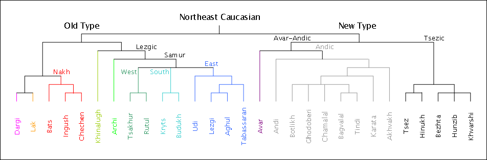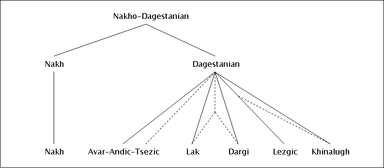 오랫동안 이 어족은 나흐어파와 다게스탄어파로 나뉘어 나호-다게스탄어족이라는 용어가 사용되었다.[16] 그러나 원어를 재구성하려는 시도는 나흐어가 다게스탄어의 여러 가지 어파들 사이의 차이만큼 다게스탄어와 차이가 나지 않는다는 것을 시사하지만,[17] 이것은 아직 보편적으로 받아들여지지는 않는다. 언어학자 베르나르 콤리 등의 연구를 바탕으로 한 다음 개요는 ''에스놀로그''에서 채택되었다. 아바르-안디-디도 어파는 폐기되었지만 슐체(2009, 2013)에서 "신형" 언어로 부활했고, 라크-다르그와어파도 마찬가지로 복귀했다.