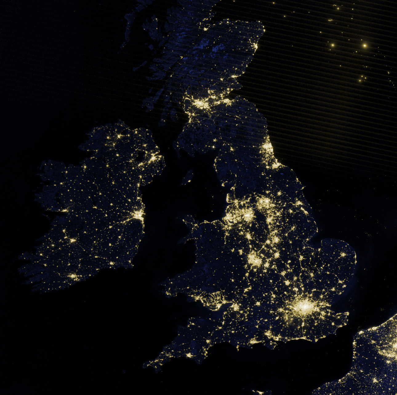 밤에 촬영한 이미지에서 남부 페나인 산맥과 북동부 해안의 도시화가 뚜렷하게 보인다.