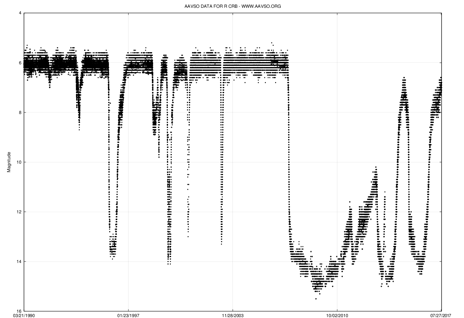 이러한 밝기 변화는 항성 대기의 탄소 먼지가 규칙적으로 축적되었다가 복사압에 의해 흩어지는 과정으로 설명된다. 급격히 어두워지는 이유는 항성에서 분출된 물질들이 빠르게 응축되어 항성에서 나오는 빛을 가리기 때문이다.[4] ISO/ESA의 관측 결과 이 별은 어두워졌을 때도 적외선 영역에서의 밝기는 크게 변하지 않았으며, 이를 통해 별 주위의 탄소 및 질소가 풍부한 화합물이 항성의 빛을 가리고 있음을 알게 되었다.[4] 항성에서 나온 물질들은 탄소 구름 형태로 응축되어 항성의 지름의 20배 정도 되는 영역까지 확장되어 존재한다.[5]