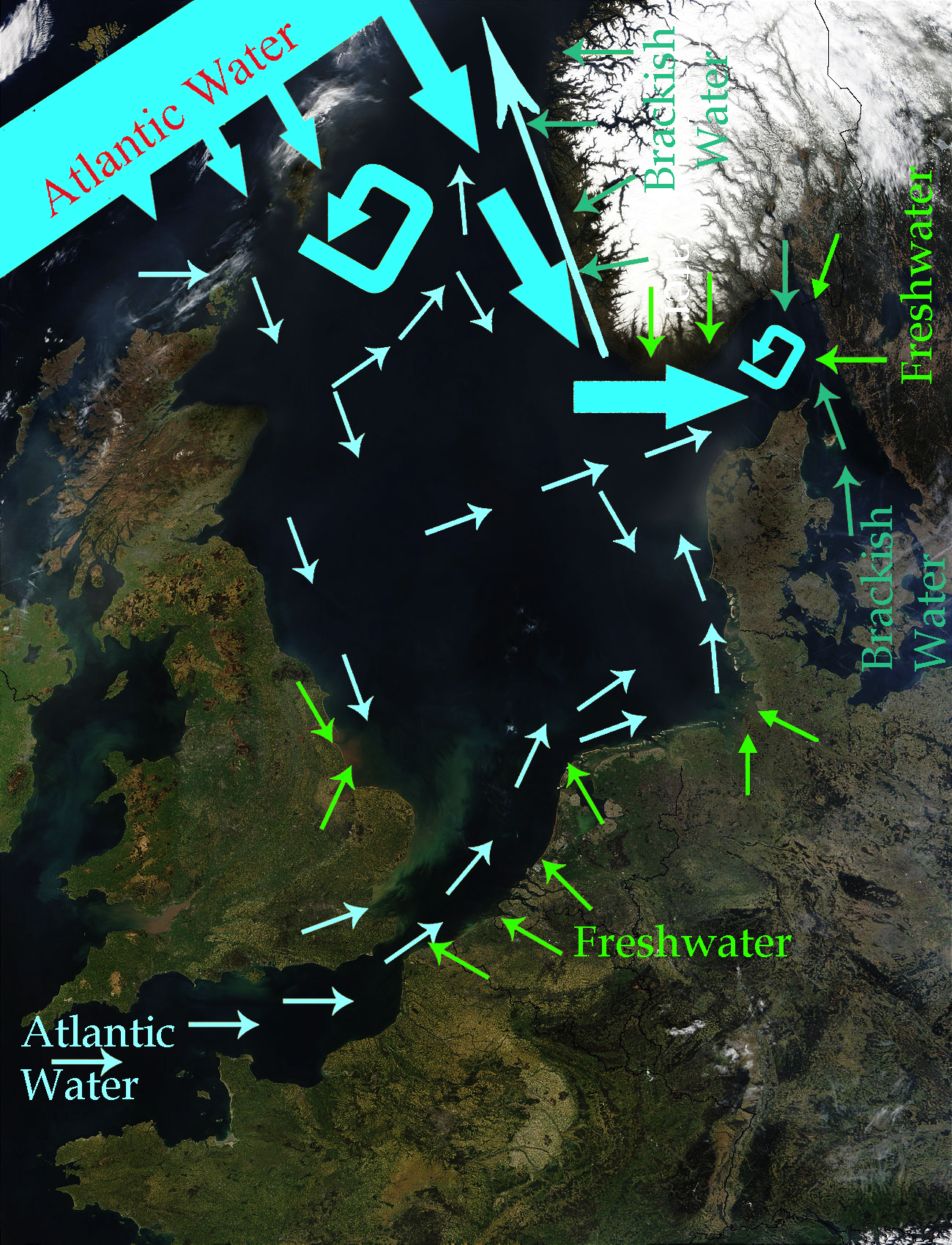 북해의 해수 흐름 주요 패턴은 가장자리를 따라 시계 반대 방향으로 회전하는 것이다.[19]