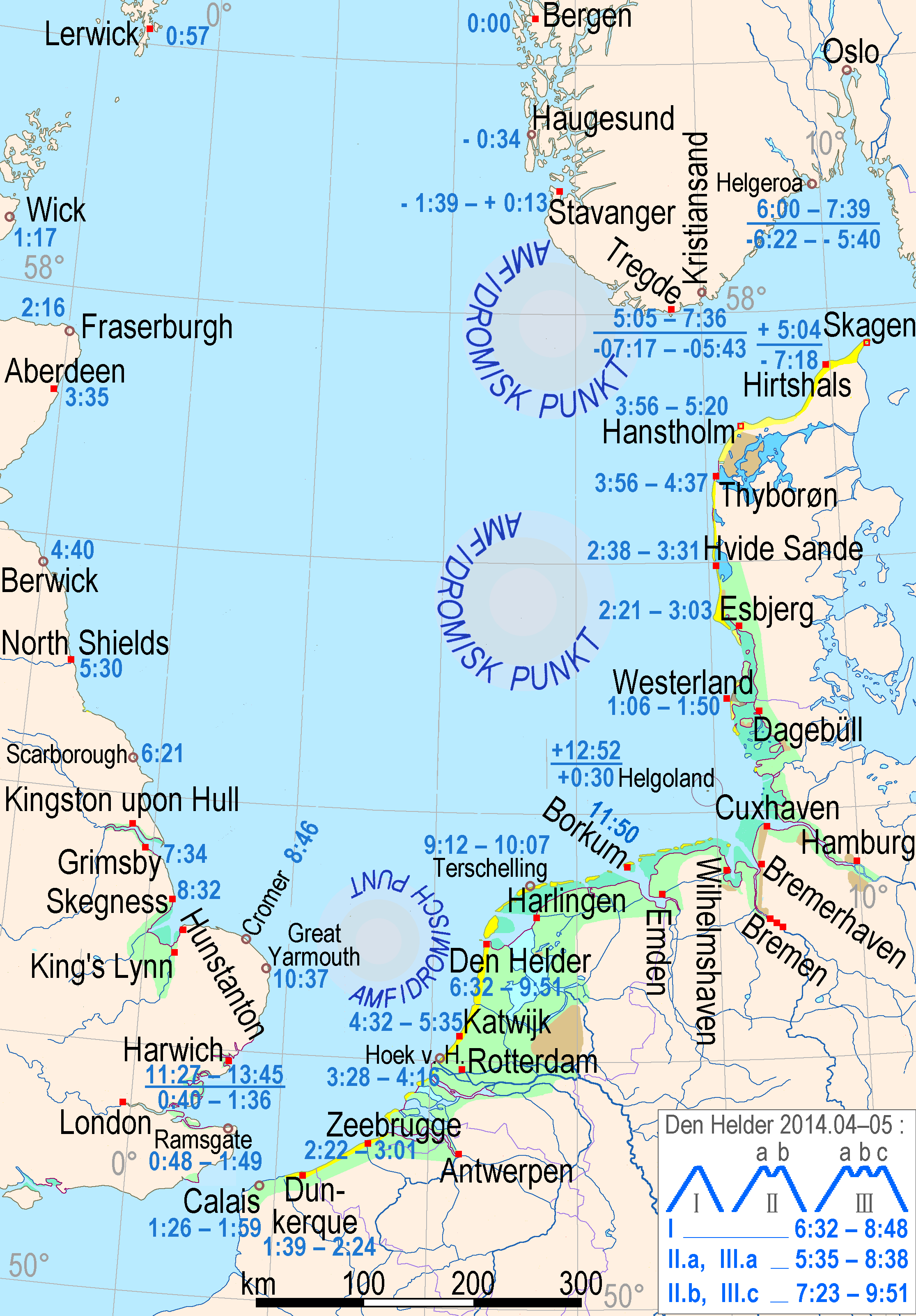 대륙붕에 위치한 북해는 심해수와 다른 파형을 갖는다. 파속은 감소하고 파고는 증가한다. 북해에는 두 개의 양진점 시스템과 세 번째 불완전한 양진점 시스템이 있다.[22][23] 북해에서 파고의 평균 조차는 0미터와 사이이다.[4]