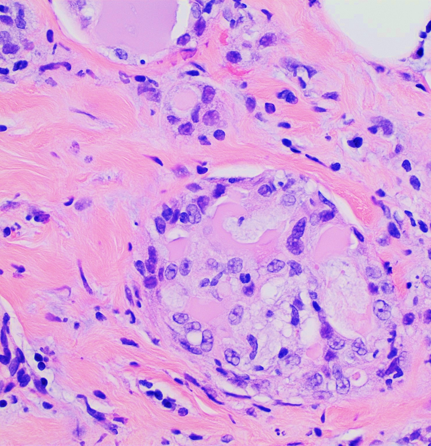 조직병리학적으로는 뚜렷한 특징을 보이며,[2] 2019년까지 보고된 순수한 "제자리암"(즉, 주변 조직을 침범하지 않은 국소화된 종양) 6건 모두에서 유두 미세 병리학 소견이 관찰되었다.[16]