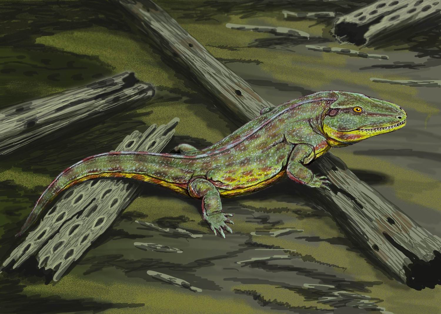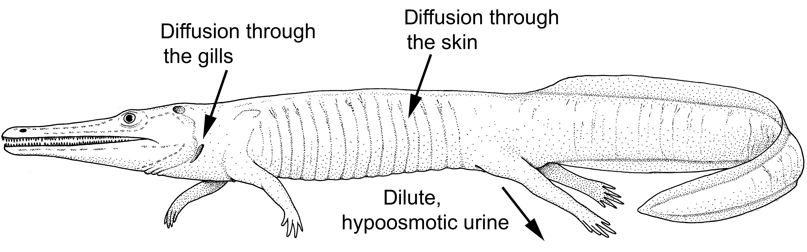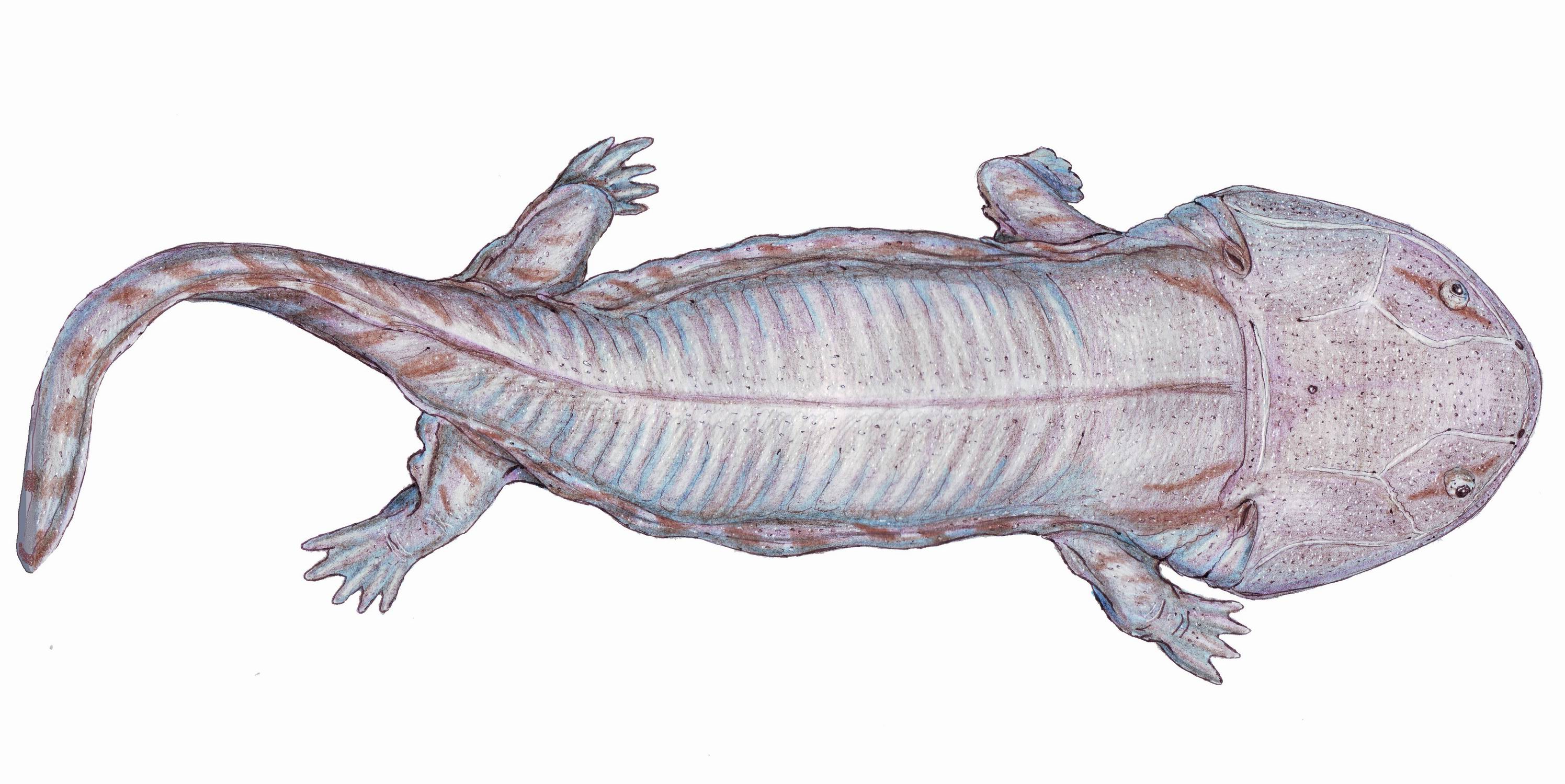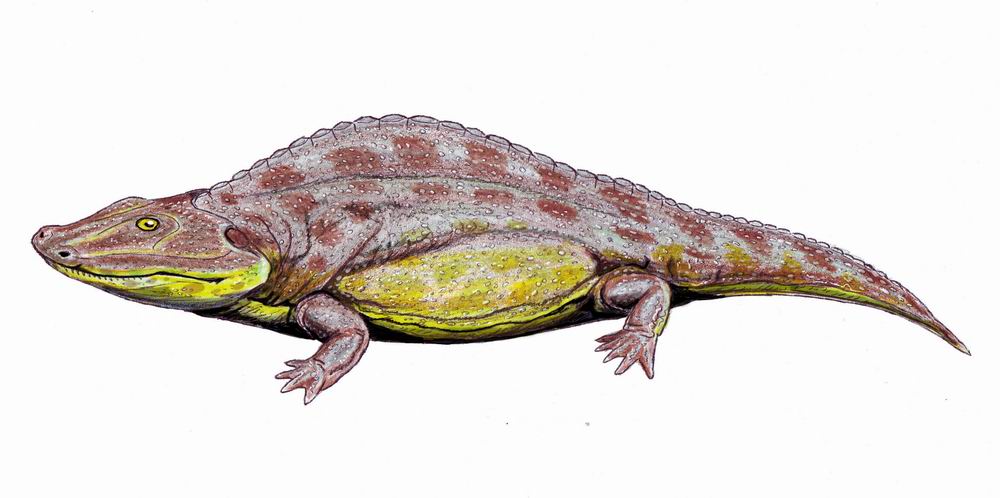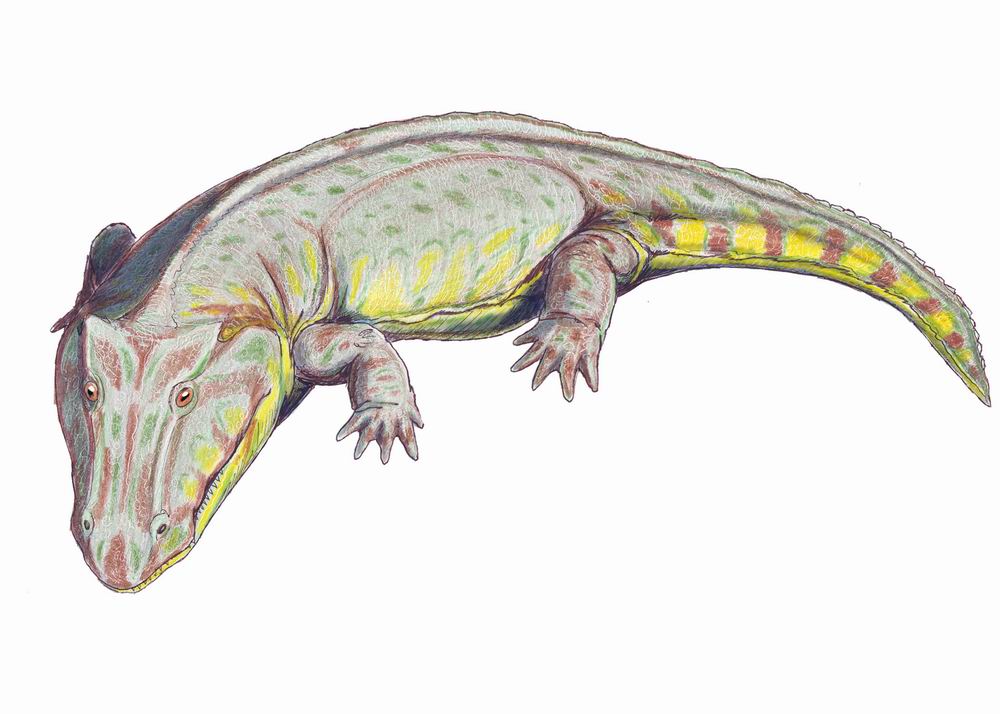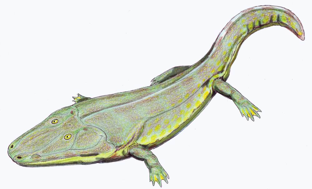 중생대 트라이아스기에는 고추류(Stereospondyli)라는 주요 그룹이 크게 번성하며 민물 생태계의 지배적인 위치를 차지했다. 이들은 점차 물 속 생활에 더욱 의존하게 되면서 척추뼈가 약해지고 다리가 작아졌으며, 대신 머리가 크고 납작해지는 등 수생 환경에 특화된 형태로 진화했다.[174] 일부 트레마토사우로이드는 바다까지 진출하기도 했으며,[175] 마스토돈사우루스와 같은 거대한 포식자도 등장했다.