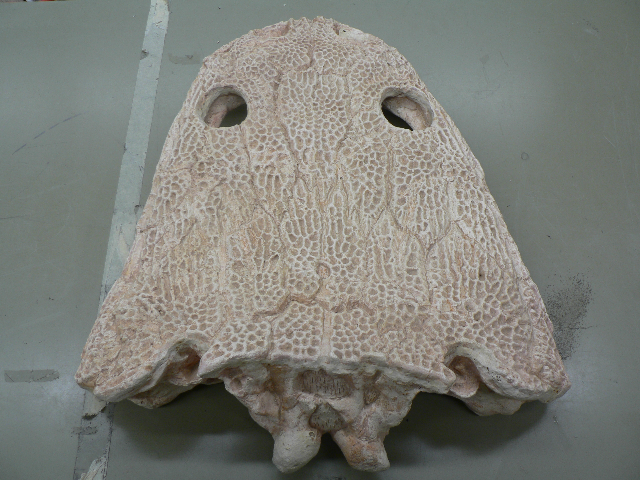 분추류 두개골의 가장 두드러진 특징 중 하나는 입천장(palate) 뒤쪽에 있는 한 쌍의 매우 큰 구멍인 간익상골 빈 공간(interpterygoid vacuity)이다.[48][49][50] 이 구멍은 근육 부착 지점을 늘려주고, 현생 개구리나 도롱뇽처럼 눈알을 입천장 쪽으로 당겨 넣어 먹이를 삼키는 데 도움을 주었을 가능성이 있다.[51][52] 호흡을 위한 구강 펌프 작용의 증거는 발견되지 않았다. 간익상골 빈 공간 앞쪽에는 코아나(choana)라는 또 다른 한 쌍의 구멍이 있어 비강과 입을 연결한다. 자매군인 탄룡목과 달리, 뇌함과 입천장을 잇는 기저 관절의 가동성은 없다.