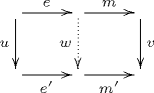 {\scriptstyle f'}\downarrow&{\scriptstyle\exists! g}\nearrow&{\scriptstyle e'}\downarrow&\nearrow{\scriptstyle m'}&{\scriptstyle f}\downarrow\\