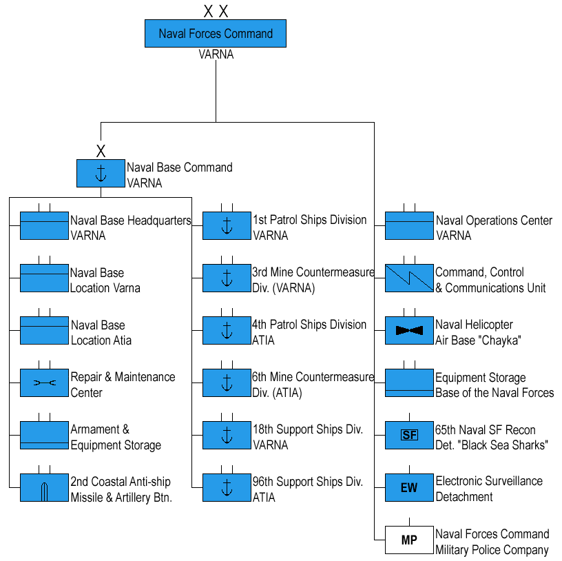 2010년 국방 백서에 따르면, 바르나와 부르가스에 있던 두 해군 기지는 두 개의 기지 시설을 갖춘 하나의 기지로 통합될 예정이었다.[1] 해군 병력은 약 3,400명의 해군으로 구성될 예정이었다.[1]