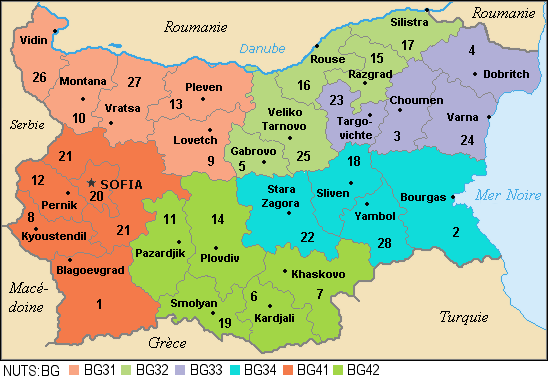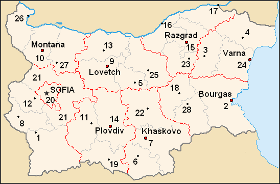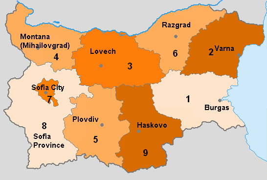 1999년 불가리아에 현행 주 제도가 도입되었다. 불가리아는 총 28개의 주(област|오블라스트bg)로 나뉜다. 소피아(특별시)는 소피아주와는 다른 독자적인 주이며, 소피아주의 주도는 소피아에 있지만, 소피아 주는 소피아를 포함하지 않는다.