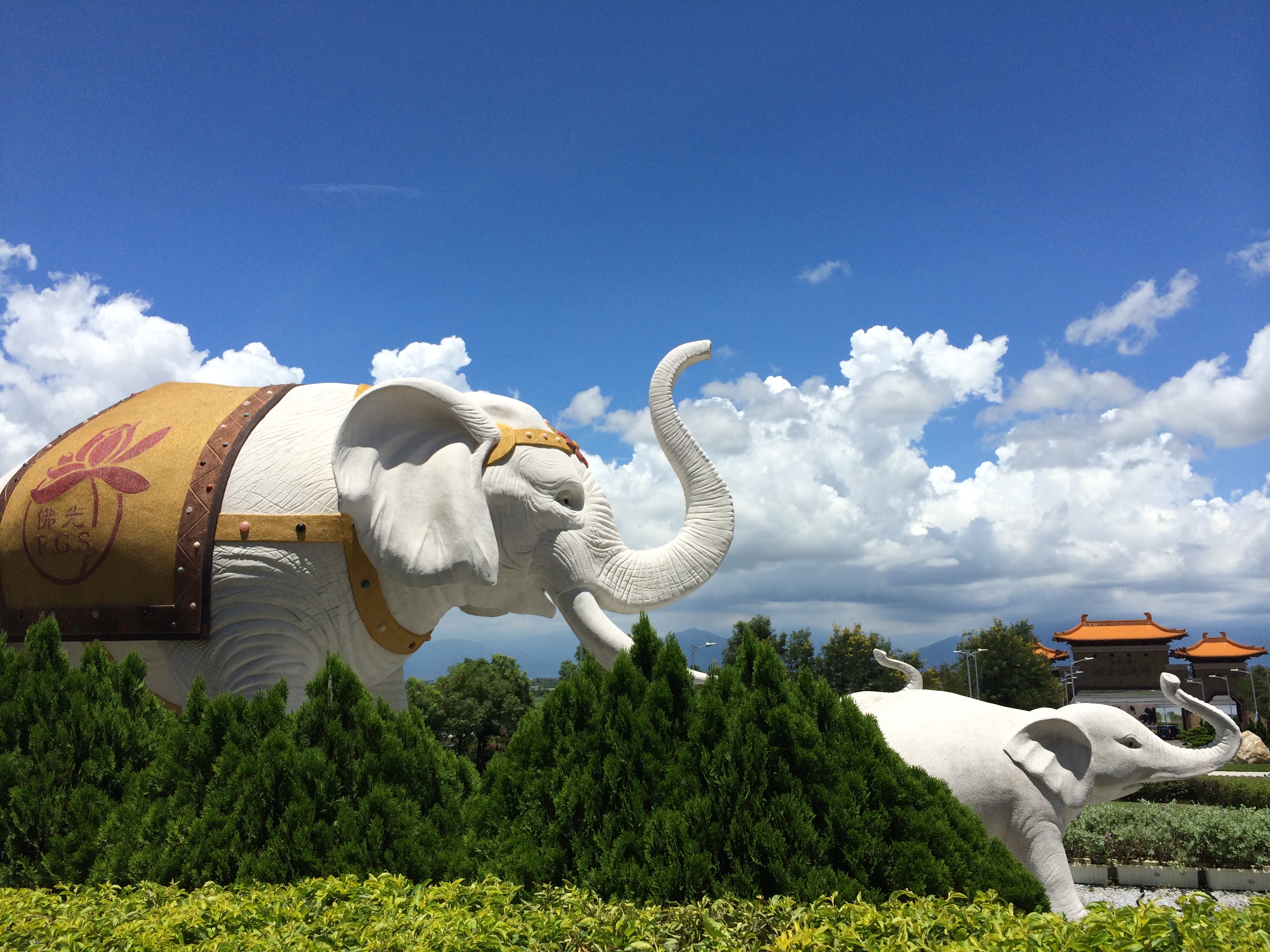 - 오른쪽의 코끼리상은 높이 5m, 길이 6m 크기로, 마야부인이 흰 코끼리가 자신의 태(胎)로 들어오는 태몽을 꾸고 석가모니를 잉태했다는 이야기에서 유래하여 부처의 탄생을 상징한다.[23]
