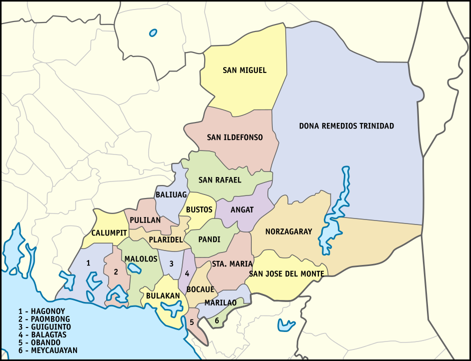 행정 구역 | 독립시: 0개 구성 시: 4개 (발리우아그, 말롤로스, 메이카우아얀, 산호세델몬테) 자치시: 20개 (앙가트, 발라그타스, 보카우에, 불라칸, 부스토스, 칼룸피트, 도냐 레메디오스 트리니다드, 기구인트, 하고노이, 마릴라오, 노르사가라이, 오반도, 판디, 파옴봉, 플라리델, 풀릴란, 산일데폰소, 산미겔, 산라파엘, 산타마리아) 바랑가이: 569개 선거구: 불라칸 주의 선거구, 산호세델몬테 시의 선거구 |