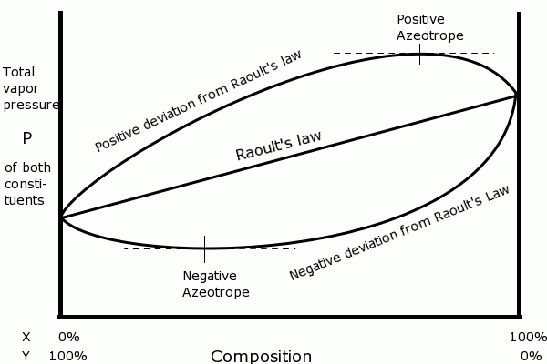 편차가 몰 분율 그래프에 대한 증기 압력에서 국소적인 최대값 또는 최소값을 일으킬 정도로 클 때, 해당 지점에서 용액 위의 증기는 액체의 조성과 동일하게 되며 공비 혼합물이 생성되는 것은 깁스-듀헴 방정식의 수학적 결과이다.[16]