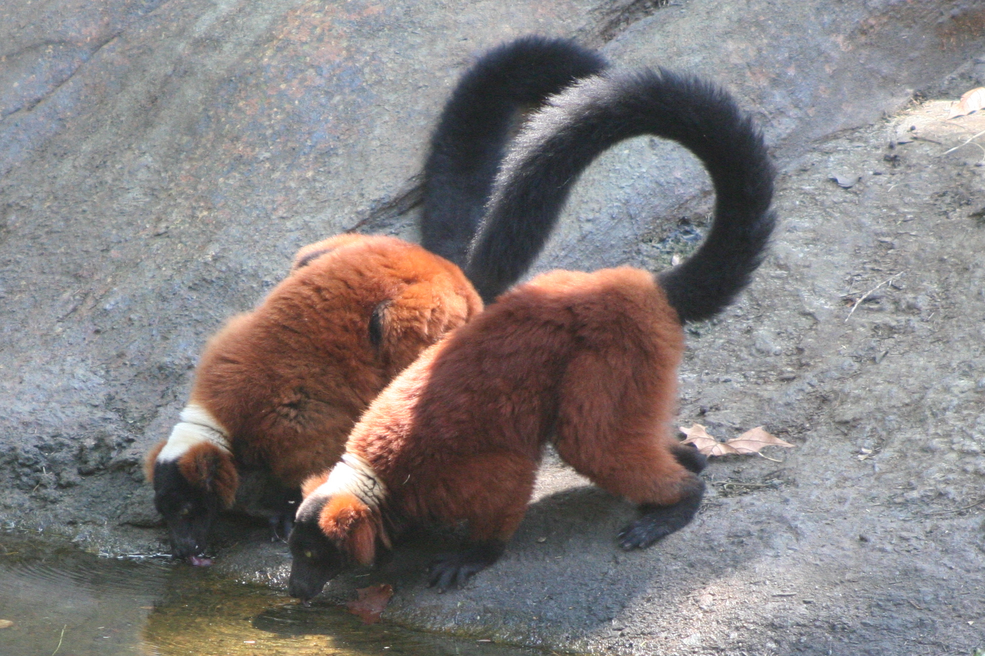 붉은목도리여우원숭이 한 쌍이 물을 마시고 있다