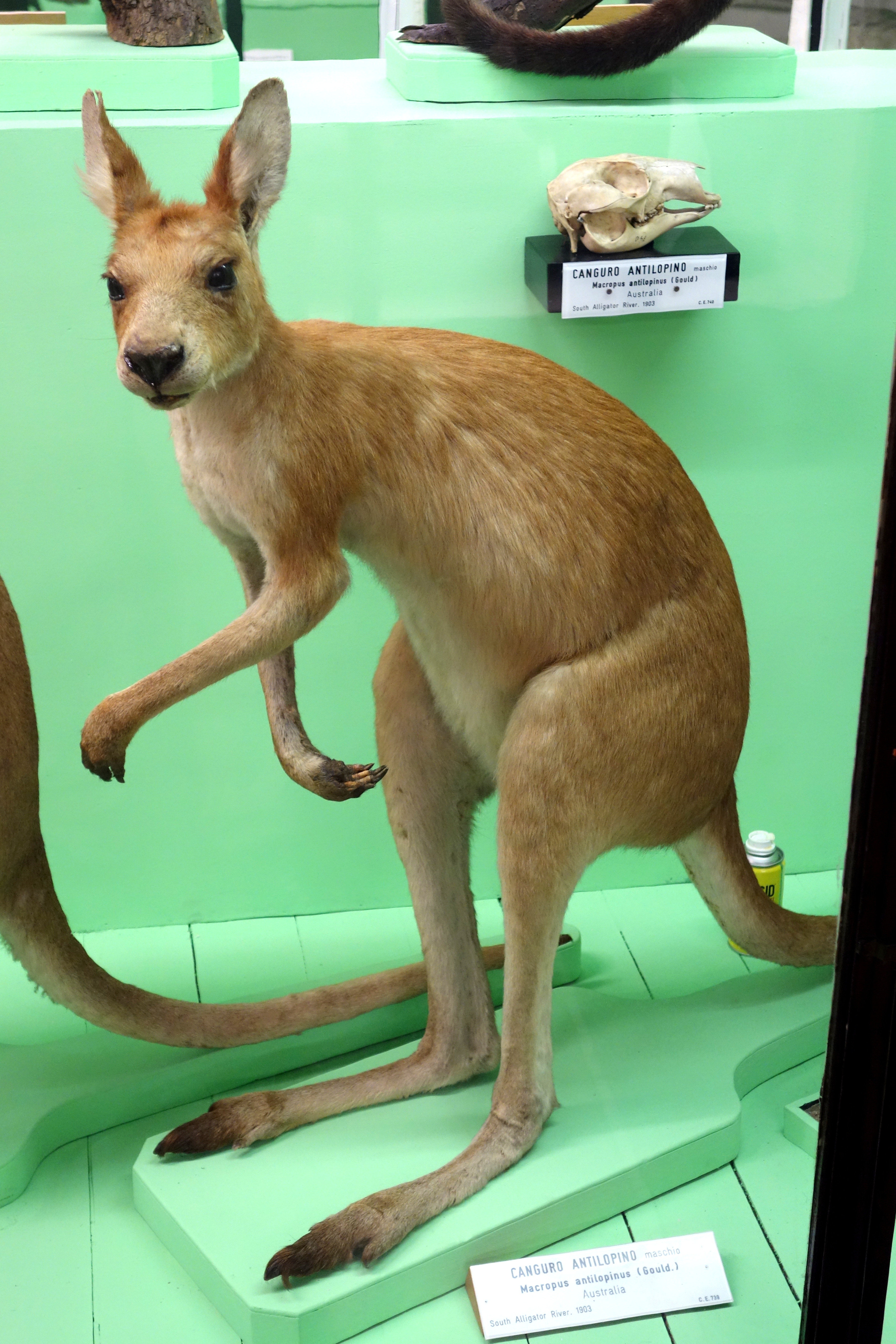 붉은캥거루는 캥거루과에 속하는 유대류로, 수컷은 붉은 갈색, 암컷은 푸른 회색 털을 가지며 호주 건조 지역에 서식하며 초본을 먹고 딩고와 맹금류에게 포식되며, 개체 수가 많아 상업적으로 이용된다. - 1842년 기재된 포유류 - 작은넓적코박쥐