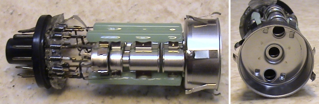 - 전자총: 음극을 가열하여 전자를 방출하고, 방출된 전자를 그리드를 사용하여 초점을 맞추고 가속시켜 브라운관 화면으로 보낸다.[186] 전자총은 브라운관 목(neck) 안에 있으며, 유리 구슬이나 유리 지지대를 사용하여 목에 고정된다.[21][186][206] 흑백 브라운관에는 전자총이 하나 있고, 컬러 브라운관에는 적색, 녹색, 청색 빛을 내는 세 개의 전자총이 있다.[186][266][397][398][399]