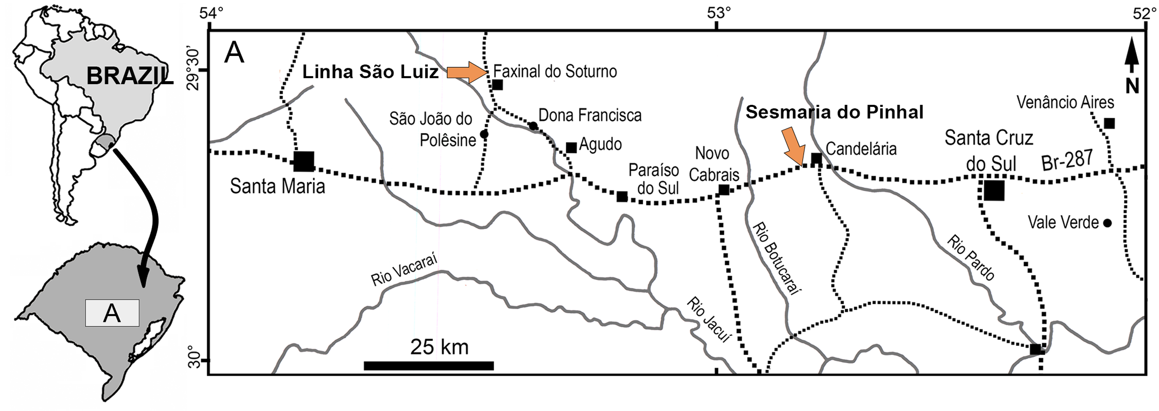 ''브라질로돈 사각치아(Brasilodon quadrangularis)''로 처음 분류된 세 개의 표본은 브라질 히우그란데두술주의 파시나우 두 소투르누 마을 근처 채석장인 Linha São Luiz 유적지에서 발견되었다. 이 화석이 발견된 암석은 산타마리아 상위층(Santa Maria Supersequence)의 칸델라리아 순층(Candelária Sequence) 상부에 속하며, 전통적으로 카투리타 지층으로 분류된다. 이 지층의 연대는 후기 트라이아스기 초기 노리아기에 해당한다. 모식표본인 UFRGS-PV-0611-T는 왼쪽과 오른쪽 위쪽 어금니가 모두 보존된 잘 보존된 두개골이지만, 아래턱은 없다. 다른 표본인 UFRGS-PV-0716-T는 6개의 어금니가 보존된 두개골의 왼쪽 앞부분으로 구성되어 있다. 표본 UFRGS-PV-0628-T는 위아래 치열 대부분이 보존된 아래턱을 포함한 부분적인 두개골이다. 이후 파시나우 두 소투르누와 칸델라리아 지역에서도 두개골 및 두개골 외의 골격 부분을 포함한 많은 ''브라질로돈'' 표본들이 추가로 발견되었다.