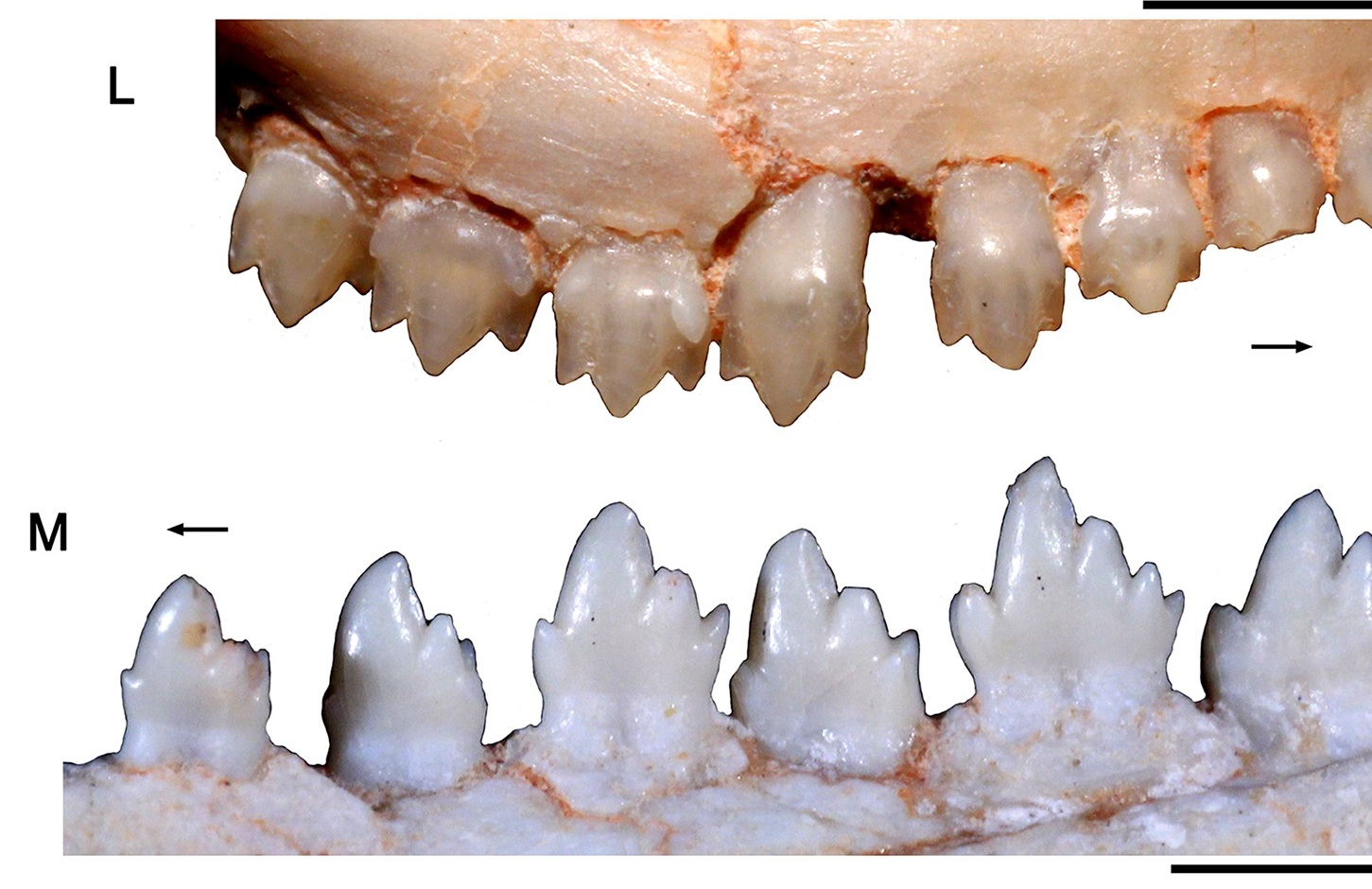 성체 표본의 송곳니는 크고 옆으로 납작했지만, 톱니는 없었다. ''브라질리테리움''에 속하는 작은 개체는 2쌍의 기능적인 송곳니가 있었는데, 이는 절치보다 약간 더 컸다.