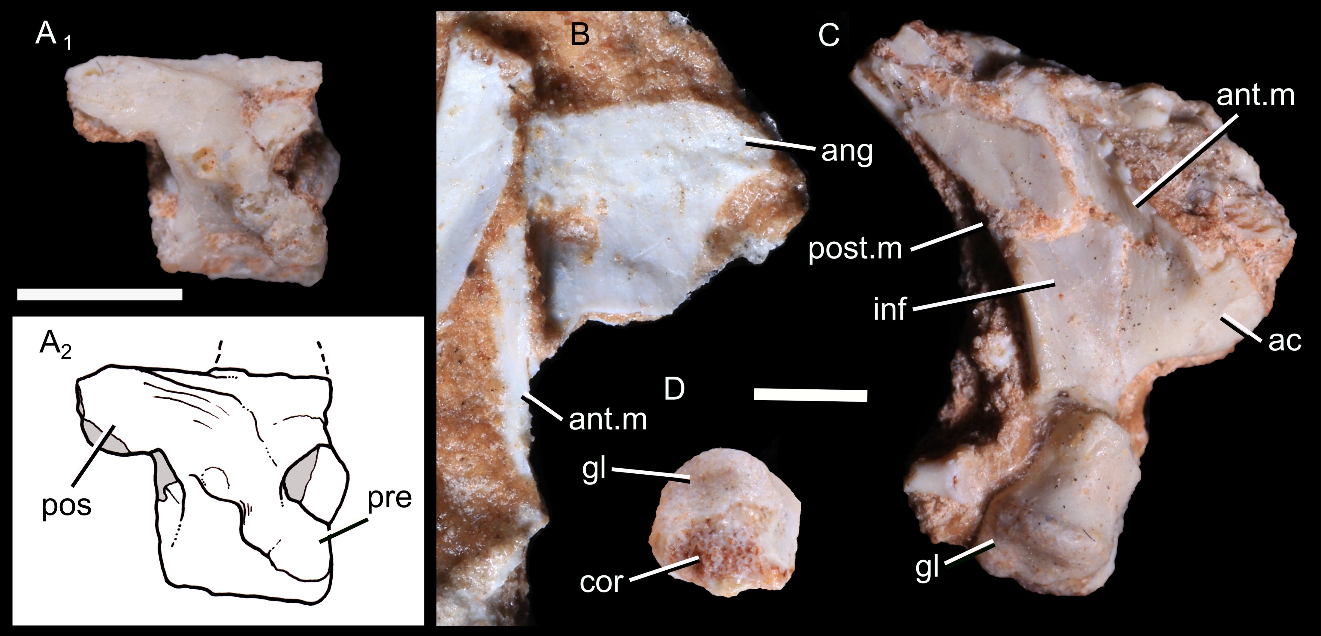 UFRGS-PV-1043-T 표본에는 오른쪽 어깨뼈(견갑골)의 아랫부분이 보존되어 있으며, 다른 두 개의 관련된 뼈 조각은 각각 등쪽(위쪽) 가장자리의 중간 부분과 앞쪽 가장자리를 나타내는 것으로 보인다. 견갑골은 다른 에피키노돈트와 마찬가지로 얇은 뼈였으며, 밑부분이 좁아졌다. 위쪽 가장자리는 다소 볼록했고, 뒤쪽 등쪽(위쪽 뒤) 각은 뾰족했다. 앞쪽과 뒤쪽 가장자리에는 다른 비포유류형 에피키노돈트에서 보이는 것처럼 옆으로 튀어나온 플랜지가 있었다. 앞쪽 가장자리 끝에는 잘 발달된 어깨 봉우리 돌기가 있었다. 어깨 봉우리는 다른 많은 키노돈트에서처럼 앞으로 뻗어 있었다. 견갑골 측면에는 깊은 극하와가 있었지만, 극상와는 없는 것으로 보인다. 견갑골의 관절와 면(상완골에 연결되는 부분)은 오목했으며 다소 타원형이었다. 관절와는 일부 초기 분기 키노돈트의 옆을 향하는 관절와와 달리 아래쪽을 향하는 것으로 보인다. 부리 돌기와 전부리 돌기는 보존되지 않았지만, 견갑골에는 이 뼈를 위한 관절면이 있었다.