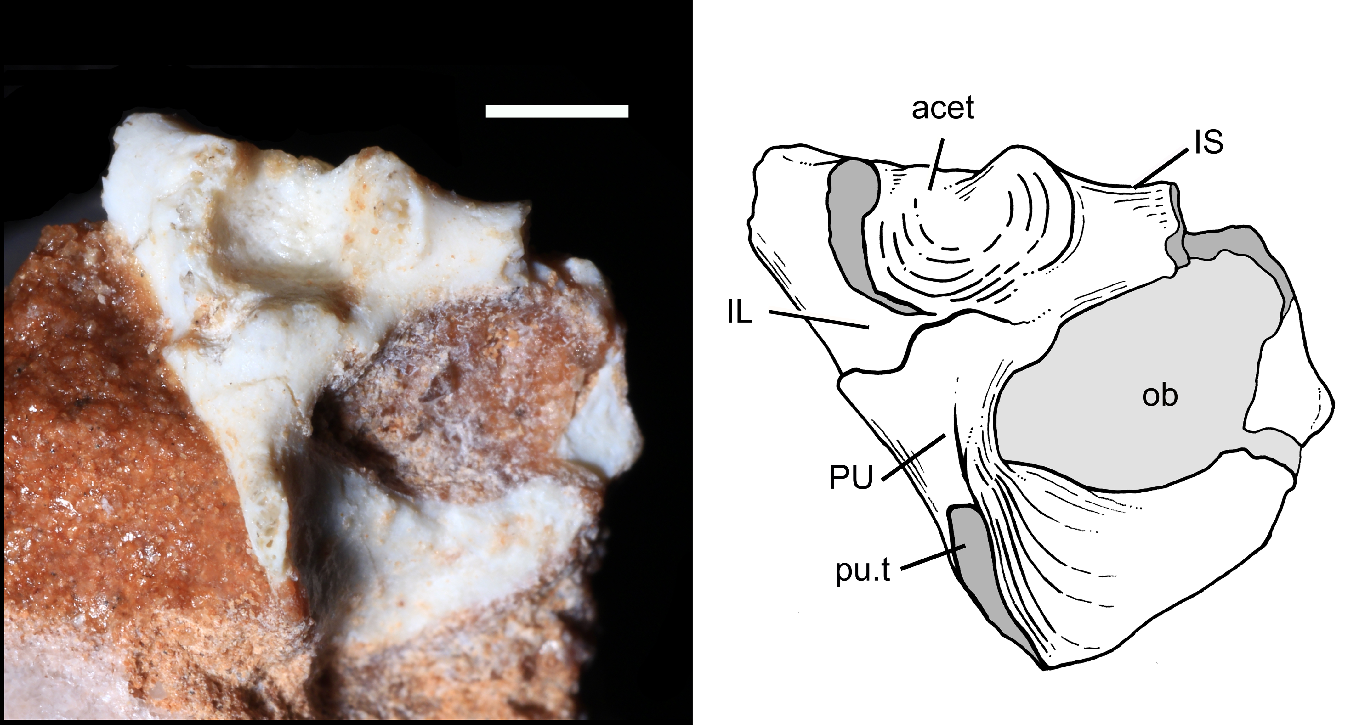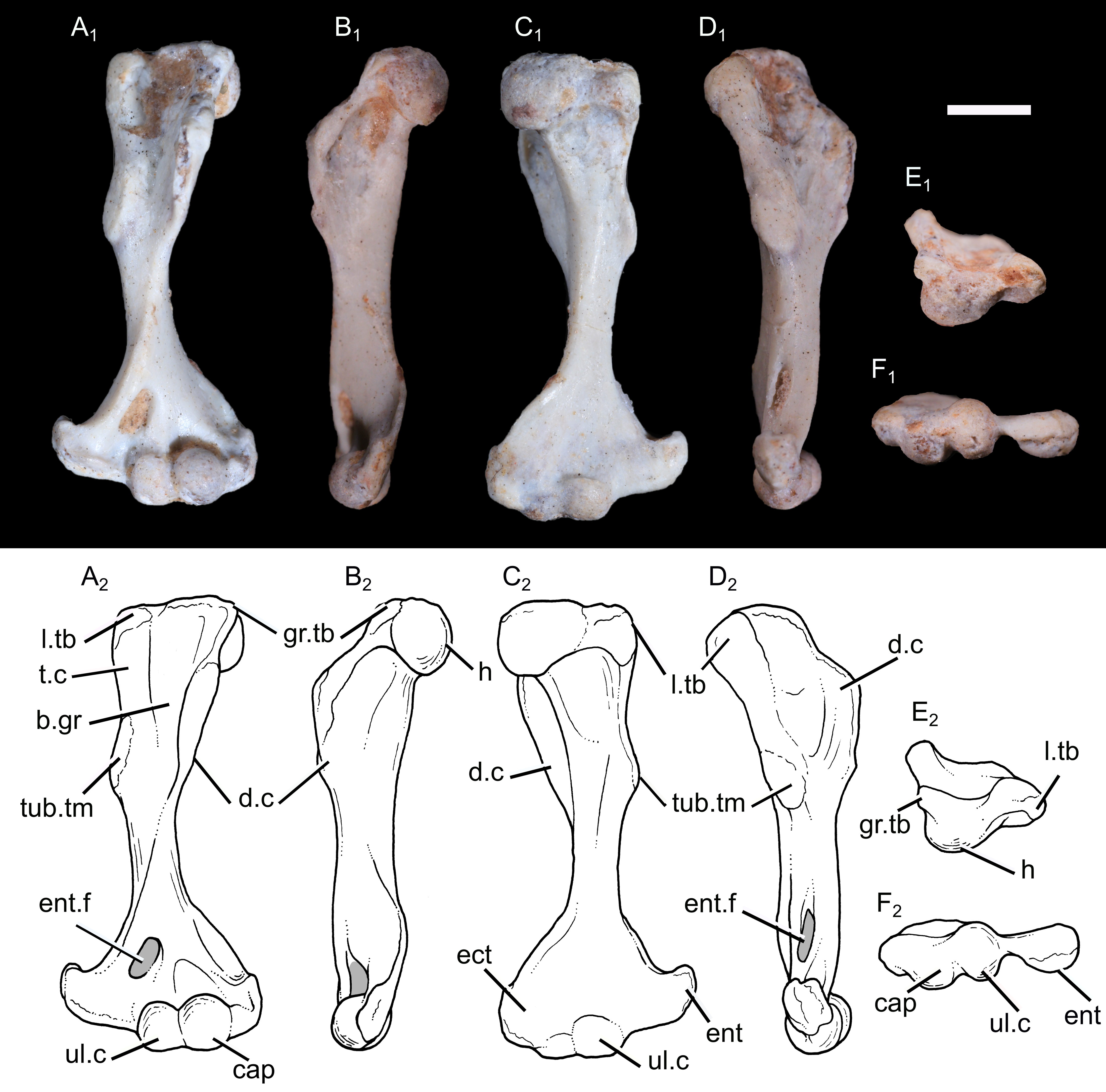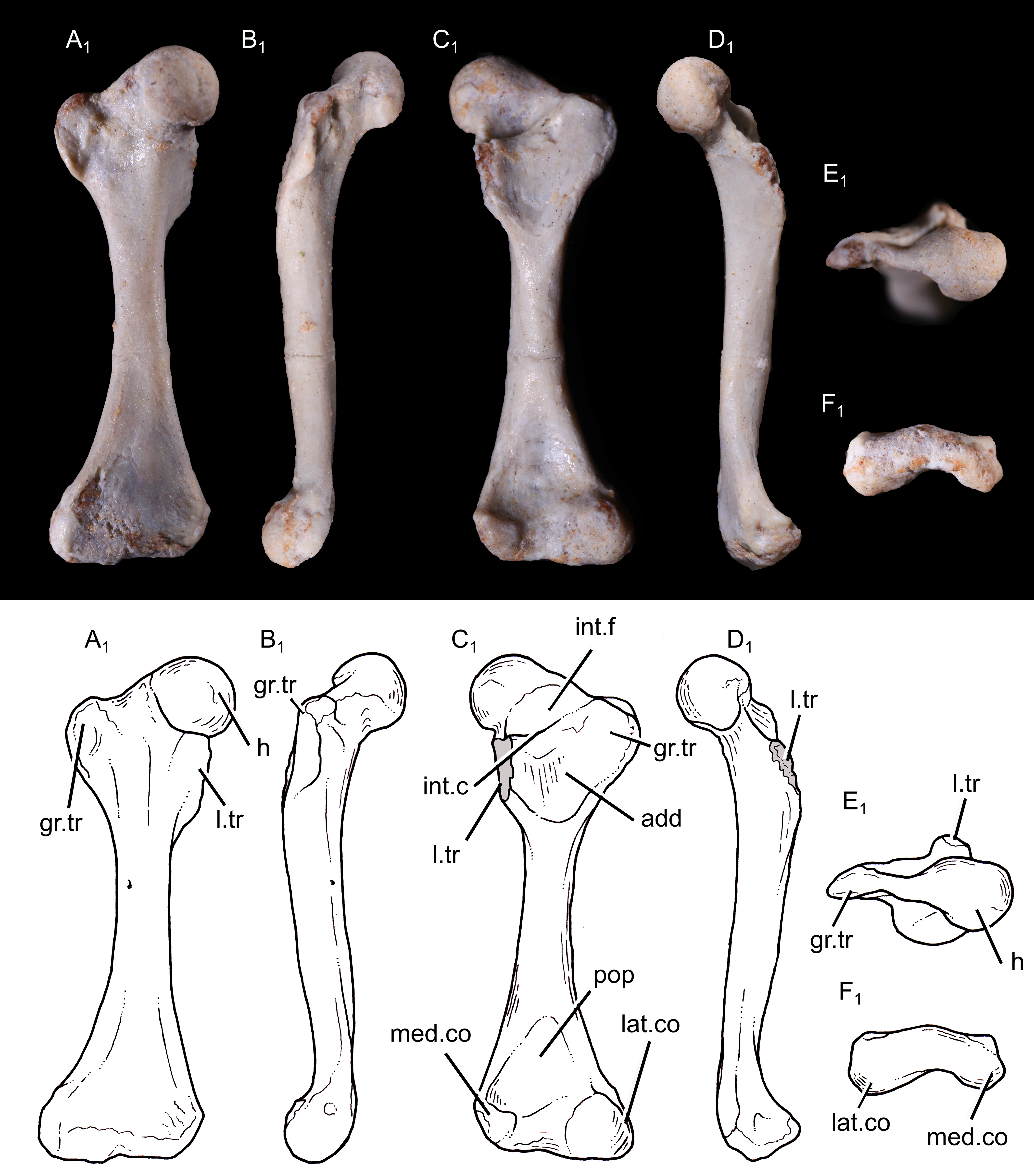 UFRGS-PV-1043-T의 오른쪽 넙다리뼈(허벅지뼈)는 15.9mm 길이이다. 넙다리뼈의 몸통은 대부분 직선이었지만, 다른 비포유류 키노돈트에서와 같이 엉덩이 관절에 가까운 부분에서 뚜렷하게 앞쪽으로 구부러져 있었다; 현대 포유류에서 이 구부러짐은 덜 발달되어 있다. 몸통의 근위 부분(엉덩이에 더 가까움)은 대부분 사각형 모양이었지만, 원위쪽(무릎쪽으로)으로 갈수록 앞뒤로 더 압축되었고, 동시에 측면에서 측면으로 더 넓어졌다. 뼈의 근위쪽 끝과 원위쪽 끝은 같은 너비를 가지고 있었다. 뼈의 근위쪽 끝에서, 넙다리 머리 (엉덩이의 비구와 연결되는 부분)는 반구형 모양을 하고 있었다. 머리는 트리틸로돈과 포유류형에서와 마찬가지로 짧은 넙다리 경부로 뼈의 나머지 부분과 분리되어 있었다; 더 원시적인 키노돈트는 넙다리 경부가 없었다. 머리는 넙다리뼈의 세로축과 비교하여 약 60도 안쪽(오른쪽으로)으로 기울어져 있었으며, 다결절 치아목과 스파라코테리드와 유사한 상태였다. 포유류형과 달리 넙다리 머리에는 머리 오목이 없었다. 넙다리 머리에서 약간 원위쪽으로, 뼈의 왼쪽에는 대전자라고 하는 잘 발달된 돌기가 있었다. 트리틸로돈과 포유류형에서도 뚜렷한 대전자가 발견되지만, 더 기초적인 키노돈트에서는 대전자가 넙다리 머리와 합쳐졌다. 뼈의 오른쪽에는 소전자라고 하는 짧은 능선이 있었다. 소전자는 오른쪽을 향했고, 다른 많은 프로베이노그나티아에서와 마찬가지로 뼈의 앞면에서 보였다. 더 기초적인 키노돈트에서는 일반적으로 더 뒤쪽을 향했고, 앞면에서는 보이지 않았다. 소전자는 기저 포유류형만큼 뼈의 근위쪽 끝을 향해 뻗어 있지 않았다. 제3전자는 없었다. 넙다리뼈의 뒷면, 대전자와 소전자 사이에는 전자간 오목이라고 하는 깊고 좁은 함몰부가 있었다. 이 오목의 원위쪽 가장자리에는 두 전자를 연결하는 전자간 능선이 있었다. 이 능선은 대부분의 테리안에서도 발견되지만, 대부분의 중생대 키노돈트 그룹에서는 발견되지 않았다. 전자간 능선에서 원위쪽으로 비교적 얕고 삼각형의 함몰부가 있었으며, 이는 엉덩이 내전근의 부착 지점 역할을 했을 것이다. 넙다리뼈 원위쪽 끝의 뒷면에는 경골, 내측 넙다리 연골 및 외측 넙다리 연골에 연결되는 두 개의 연골이 있었다. 내측 연골은 측면에서 측면으로 압축되었다. 슬와와는 삼각형 모양을 하고 있었고 연골 근처에 위치했다.