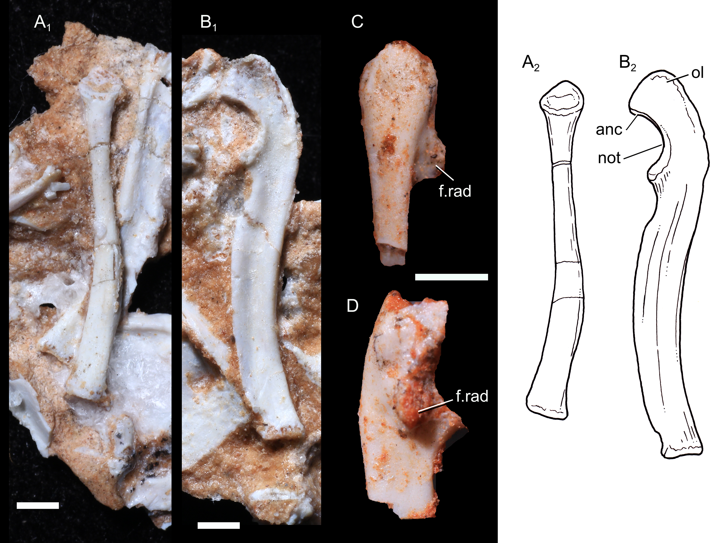 UFRGS-PV-1043-T의 왼쪽 요골(노뼈)은 14mm 길이이다. 요골은 가늘었고, 근위쪽 끝(팔꿈치에 더 가까움) 근처에 원형 단면이 있었다. 요골의 머리(상완골과 연결되는 곳)는 대략 원형이었으며, 중간에 컵 모양의 움푹 들어간 곳이 있고 둥근 테두리로 둘러싸여 있었다. 머리는 약간 앞쪽 안쪽(앞 오른쪽)으로 기울어져 있었다. 머리의 뒤쪽 안쪽(뒤쪽 오른쪽)에는 척골의 요골 절흔과 연결되었을 작은 관절면이 있었다. 이두근의 부착을 위한 요골 조면은 없었다. 뼈의 원위쪽 끝(손목에 더 가까움)은 평평한 직사각형 모양이었다. 원위쪽 끝은 다소 뒤쪽 안쪽으로 구부러져 있었으며, 트리틸로돈, ''모르가누코돈'' 및 주머니쥐에서처럼 뼈가 척골의 앞쪽을 가로지를 수 있도록 했다. 원위 관절면(손목에 연결되는 곳)도 직사각형 모양이었다.