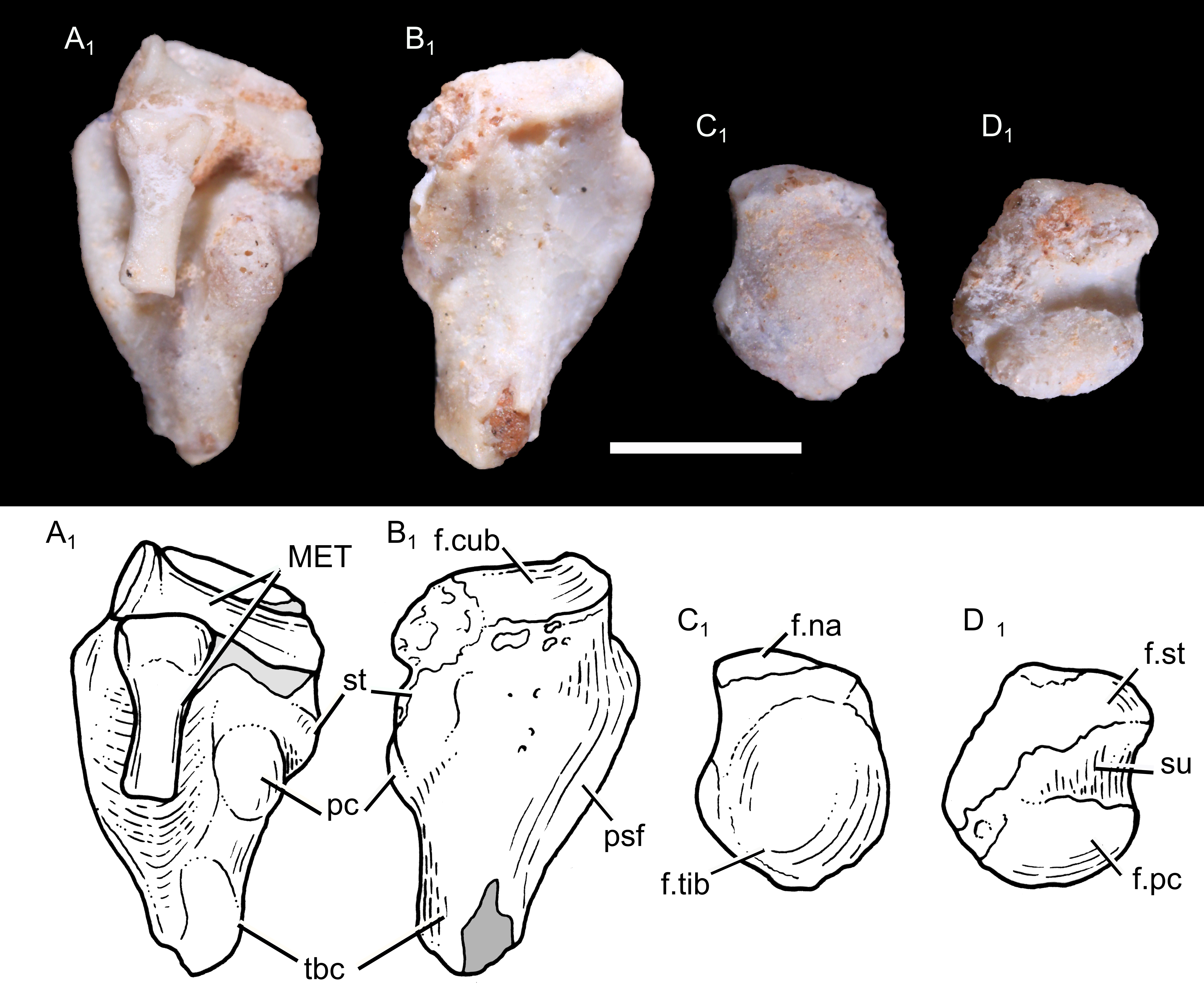 UFRGS-PV-1043-T는 또한 두 개의 불완전한 중족골을 보존하며, 족근골과 각각 지절골에 연결되었을 근위쪽 끝과 원위쪽 끝으로 구성된다. 근위쪽 끝에는 원형 함몰부가 있었고, 원위쪽 끝에는 두 개의 대칭 연골이 있었다. 가능한 중족골(중족골 또는 중수골) 단편은 또한 UFRGS-PV-0765-T 표본에서 알려져 있는데, 넓은 근위 부분을 가지고 있었고 몸통은 더 좁았다. 이 두 표본은 또한 일부 지절골 (손가락뼈 또는 발가락뼈)을 보존하며, UFRGS-PV-0765-T는 거의 완전한 중간 지절골을 보존한다. 이 지절골은 상당히 짧았으며, 오목한 근위쪽 끝과 원위쪽 끝에 두 개의 작은 연골이 있었다.