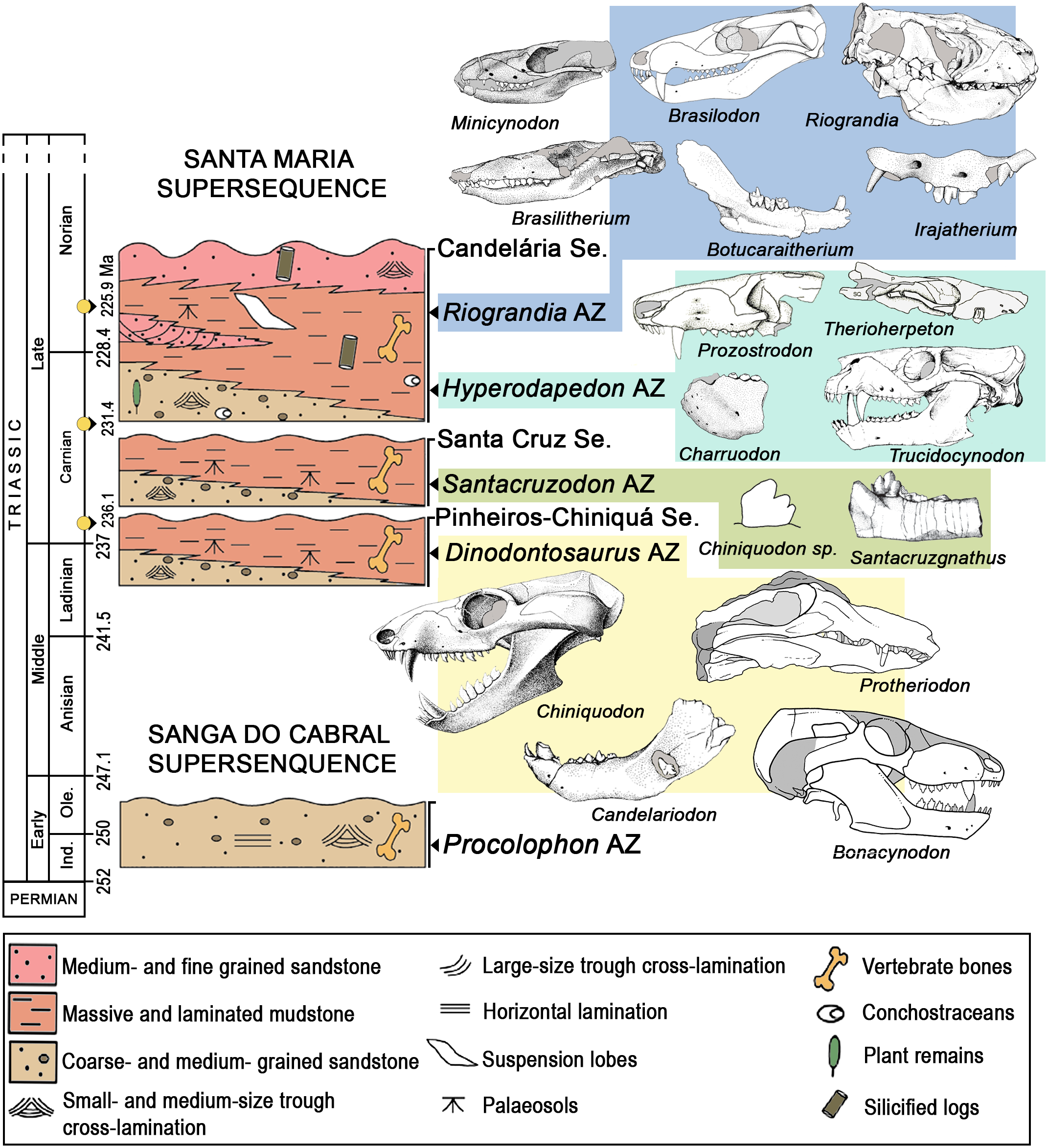 - 키노돈트: 트리텔로돈트인 ''이라자테리움''(Irajatherium)과 ''리오그란디아''(Riograndia), 초기 포유류형 동물인 ''보투카라이테리움''(Botucaraitherium), 그리고 분류가 불확실한 트라베르소돈트.