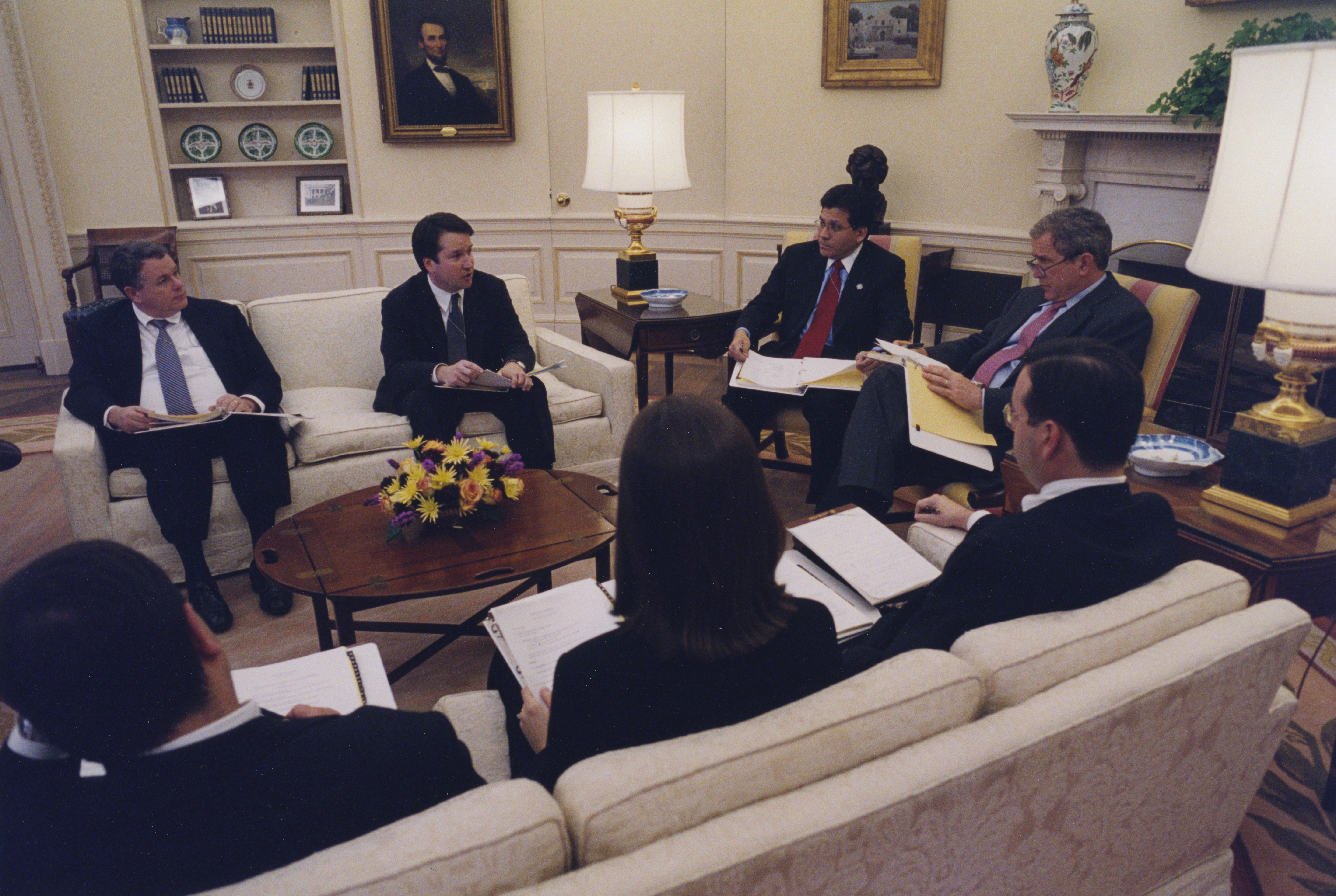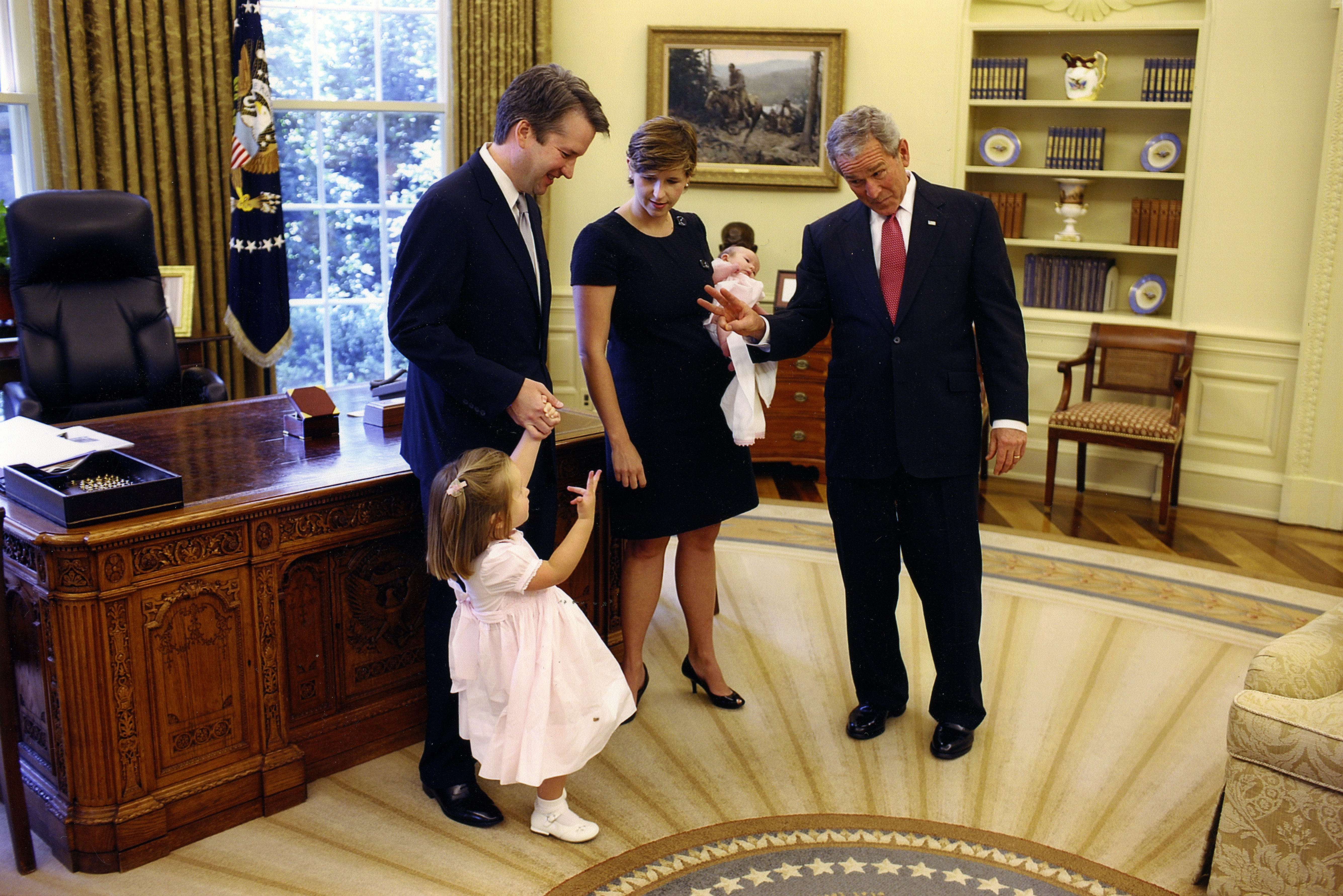 부시 대통령, 앤디 카드(Andy Card), 콘돌리자 라이스(Condoleezza Rice)와 함께 있는 캐버노(파란색 셔츠)