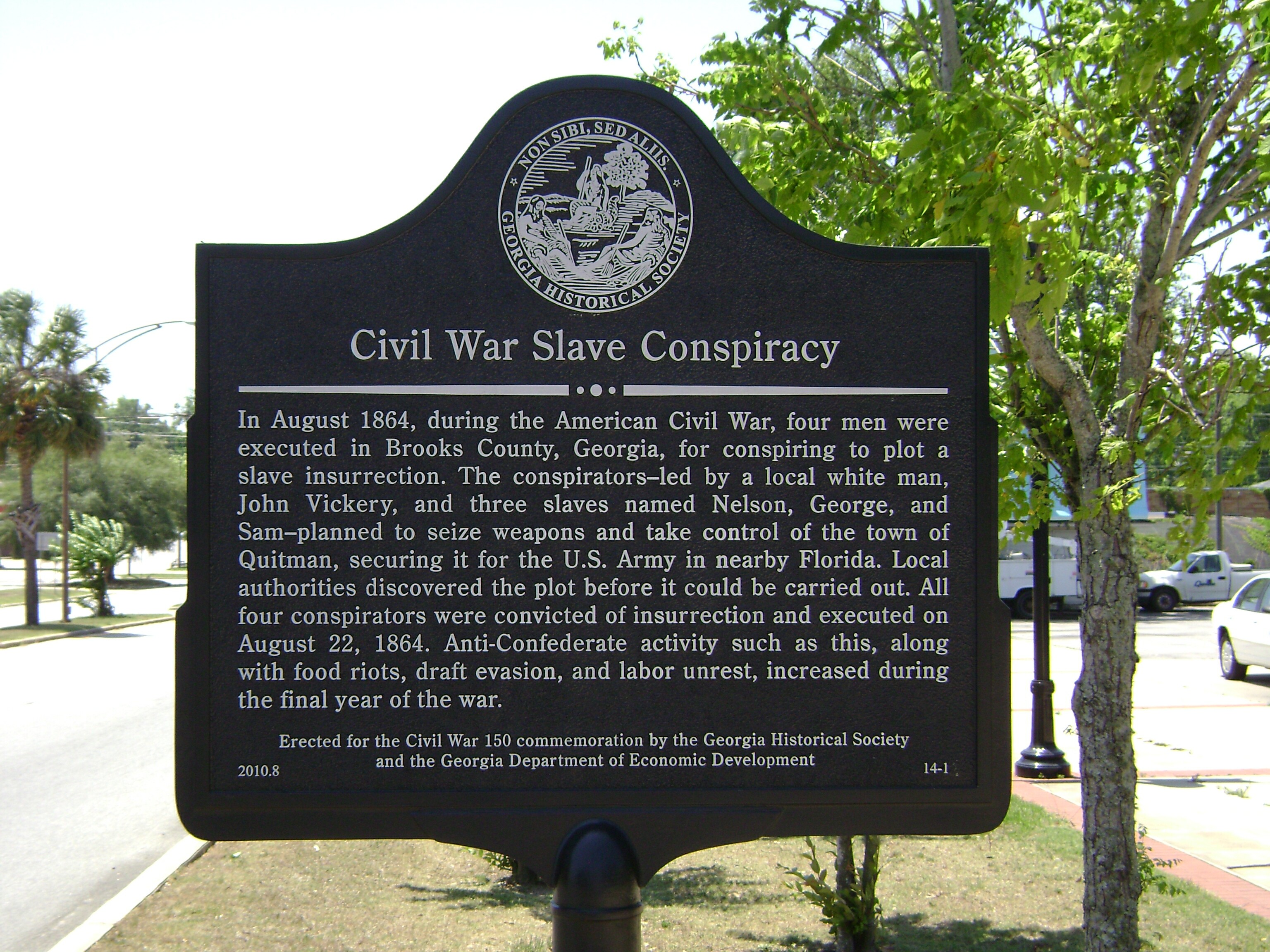 1864년 8월, 존 비커리를 중심으로 한 노예 반란 음모가 발각되었다. 이들은 노예 소유주를 살해하고 무기를 훔쳐 퀴트만과 매디슨에 불을 지른 뒤, 북부 연합군에게 도움을 받을 계획이었다. 그러나 반란 전날 저녁, 한 노예가 절도 혐의로 체포되면서 음모가 드러났다. 비커리와 4명의 노예 용의자들은 군사 재판을 받고 1864년 8월 23일 퀴트만에서 공개 처형되었다.[5]