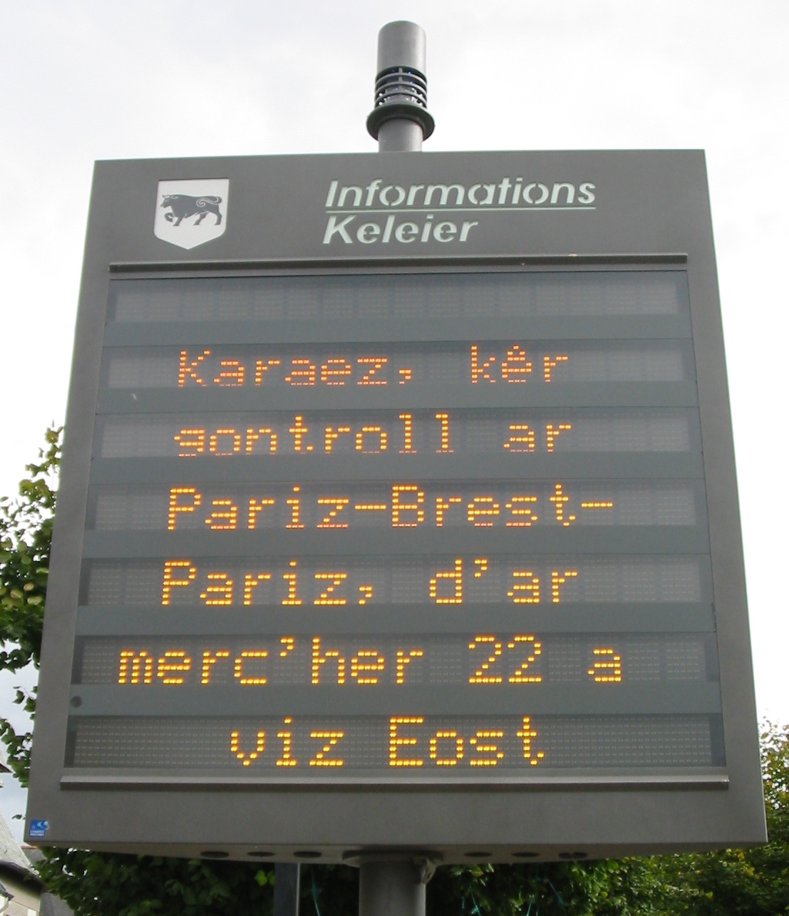 캥페르 등 브르타뉴 주요 도시에서는 도시 안내판에 프랑스어와 브르타뉴어를 병기하고, 은행 ATM 표시 등에도 적극적으로 사용하고 있다. 또한 브르타뉴어 수표를 발행하는 은행도 있다.