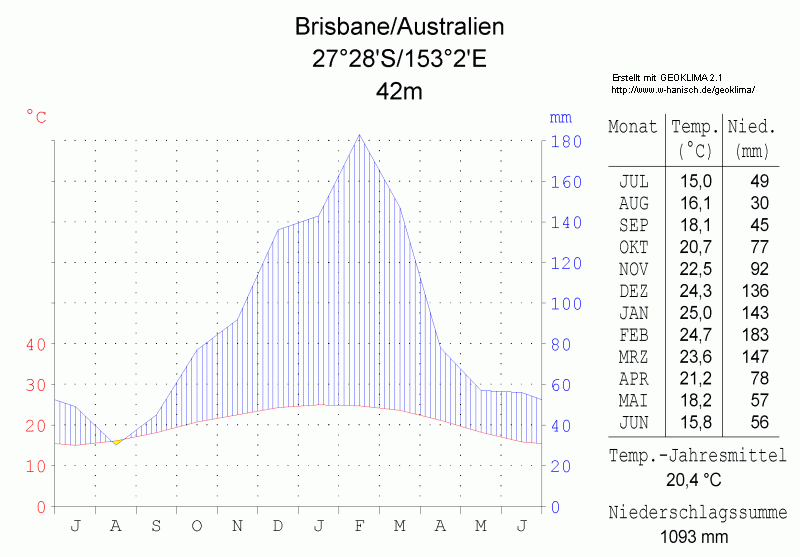 브리스번에서 기록된 최고 기온은 1940년 1월 26일의 43.2°C이다. 2007년 7월 19일에는 브리스번 공항에서 사상 처음으로 영하의 기온인 -0.1°C를 기록했다.[129] 2009년 8월 24일에는 겨울철 최고 기온인 35.4°C를 기록했다.[131] 1887년 1월 21일에는 하루 동안 465mm의 비가 내려 오스트레일리아 주도 중 최대 강수량을 기록했다.