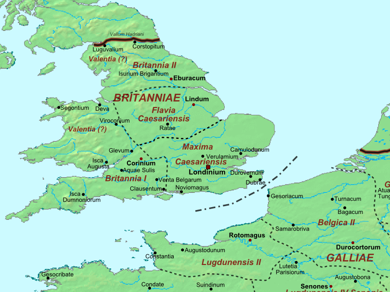 이들 속주의 정확한 경계와 수도 위치는 여전히 논쟁의 대상이다. 314년 아를 공의회에 참석한 브리타니아 주교들의 명단이 중요한 단서가 되지만, 기록 자체에 오류가 있어 해석이 분분하다.[45] 예를 들어, 명단에는 에보라쿰(요크)의 주교 외에 런던 출신 주교가 두 명(de civitate Londinensila와 de civitate colonia Londinensiumla)으로 기록되어 있는데, 이는 필사 오류로 보고 콜체스터, 링컨, 카얼레온 등 다른 도시를 가리키는 것으로 수정하려는 시도가 있었다.[46][47][48][50][51][52][53][54] 현대 학자들은 일반적으로 교구 행정 중심지였던 런디니움(런던)을 막시마 카이사리엔시스의 수도로, 웨일스와 서부 지역을 포함하는 브리타니아 프리마의 수도는 코리니움 도부노룸(시렌체스터)으로, 막시마 북쪽의 플라비아 카이사리엔시스 수도는 린둠 콜로니아(링컨)으로, 가장 북쪽의 브리타니아 세쿤다 수도는 에보라쿰(요크)으로 추정한다. 발렌티아의 위치는 여전히 불확실하여, 체스터 주변, 하드리아누스 장벽 근처의 루구발리움(칼라일) 주변, 또는 두 장벽 사이 지역 등 다양한 가설이 존재한다.