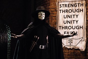V는 DC 코믹스의 가상 인물로, 파시스트 정권의 강제 수용소에서 의학 실험을 통해 초인적인 능력을 얻은 후 복수를 계획한다. 그는 가이 포크스 가면을 쓰고, 정부를 전복하고 아나키 사회를 건설하려 한다. 이비 하몬드를 만나 동료로 삼고, 11월 5일에 웨스트민스터 궁전을 폭파하는 등 일련의 공격을 감행한다. 결국 핀치에게 죽음을 맞이하지만, 이비에 의해 바이킹 장례를 치르고, 그의 유산은 이어진다. 2005년 영화 '브이 포 벤데타'로 각색되었으며, 휴고 위빙이 V 역을 맡았다.