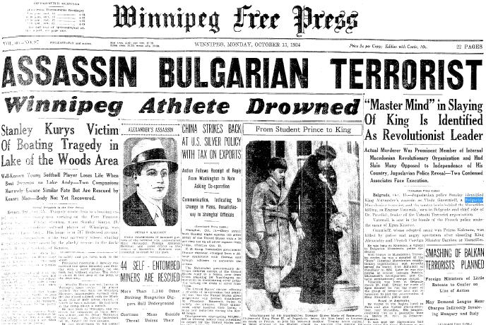 1934년 10월 15일자 ''위니펙 프리 프레스'' 1면, 유고슬라비아 알렉산드르 1세 국왕 암살 언급