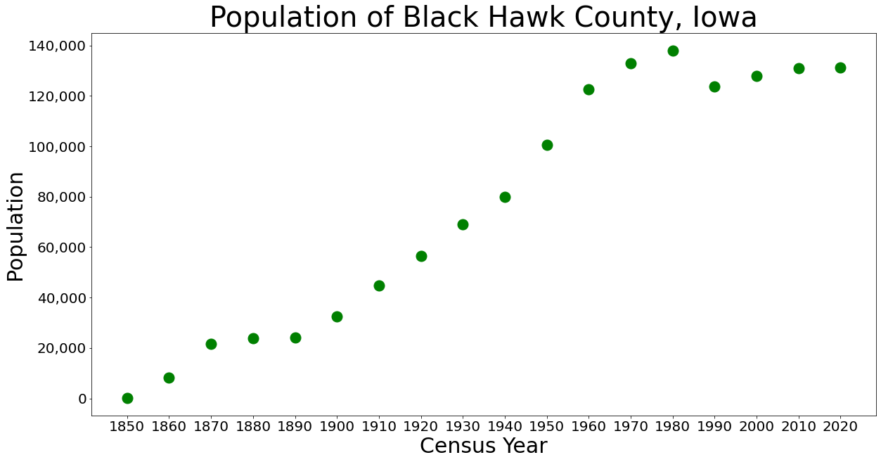 블랙호크 군의 인구 통계는 1850년부터 2023년까지의 인구 변화를 보여준다. 2000년, 2010년, 2020년 인구 조사 자료를 바탕으로 인종, 가구, 소득 등에 대한 상세한 정보를 제공한다.