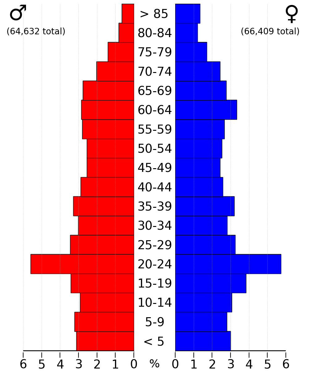 연령 분포는 18세 미만 23.10%, 18세~24세 15.70%, 25세~44세 25.20%, 45세~64세 22.00%, 65세 이상 14.00%였다. 중간 연령은 34세였다. 여성 100명당 남성은 92.30명이었다. 18세 이상 여성 100명당 남성은 88.80명이었다.