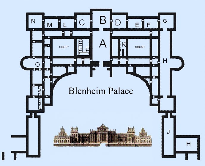 블레넘 궁전은 초대 공작의 유명한 후손인 윈스턴 처칠이 태어난 곳이며, 그의 삶과 시대는 그가 태어난 방의 스위트룸에 있는 영구 전시회를 통해 기념된다("계획에서 "K"로 표시"). 블렌하임 궁전은 모든 주요 및 부속 방이 ''피아노 노빌레''에 위치하도록 설계되었으며, 따라서 웅장한 국빈용 계단은 없다. 그러한 지위에 걸맞은 사람은 ''피아노 노빌레''를 떠날 이유가 없었기 때문이다. 블렌하임에 웅장한 계단이 있다면, 그것은 대법정에서 북쪽 현관으로 이어지는 일련의 계단이다. 중앙 블록에는 크고 작은 다양한 계단이 있지만 궁전만큼 웅장한 규모로 설계된 것은 없다. 제임스 손힐은 1716년에 홀의 천장을 그렸다. 그 천장에는 말버러가 브리타니아 앞에 무릎을 꿇고 블렌하임 전투 지도를 바치는 모습이 묘사되어 있다. 홀은 약 20.42m 높이며, 주로 크기와 기번스의 석조 조각으로 유명하지만, 거대한 크기에도 불구하고 살롱으로 이어지는 광대한 전실에 불과하다.[35]