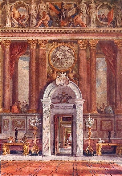 공작은 정복자 루이 14세의 30톤 대리석 흉상을 등지고 앉을 예정이었으며, 이는 남쪽 포르티코 위에 배치되었다. 여기서 패배한 왕은 파르테르와 전리품을 굴욕적으로 내려다보게 되었다. 공작은 이러한 헌사가 실현되는 것을 보지 못하고 사망했다. 공작 부부는 궁전 동쪽 아파트로 이사했지만, 전체는 공작 사후에 완공되었다.[31]