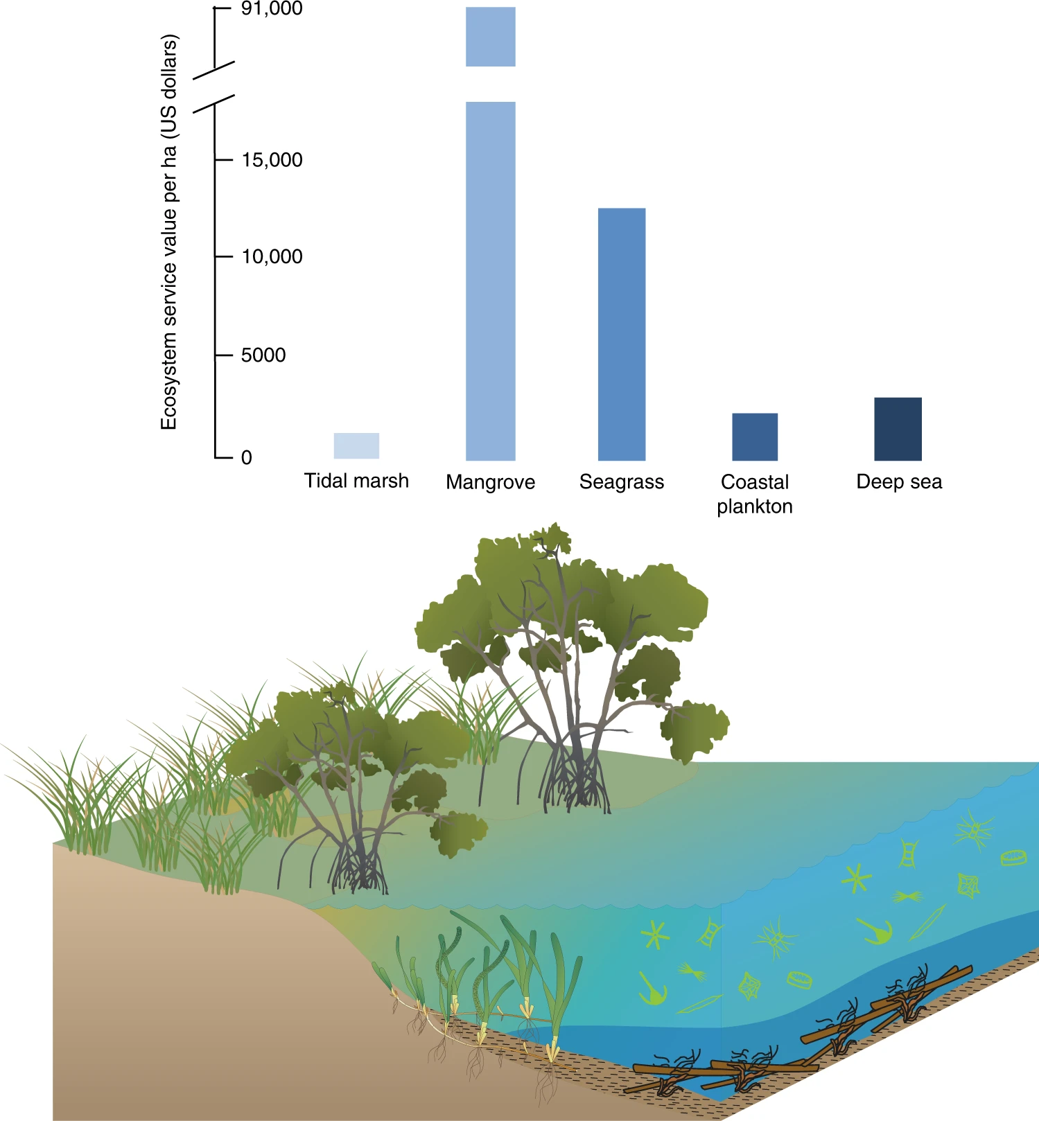 이러한 식생 해안 생태계는 육상 식물보다 면적은 좁고 지상부 바이오매스는 적지만, 특히 퇴적물에 탄소를 저장하는 능력이 뛰어나 장기적인 탄소 격리에 큰 잠재력을 가지고 있다.[16] 이들은 대기 중의 CO2를 포획하여 지하 및 지상 바이오매스, 그리고 죽은 바이오매스 형태로 저장한다.[15]