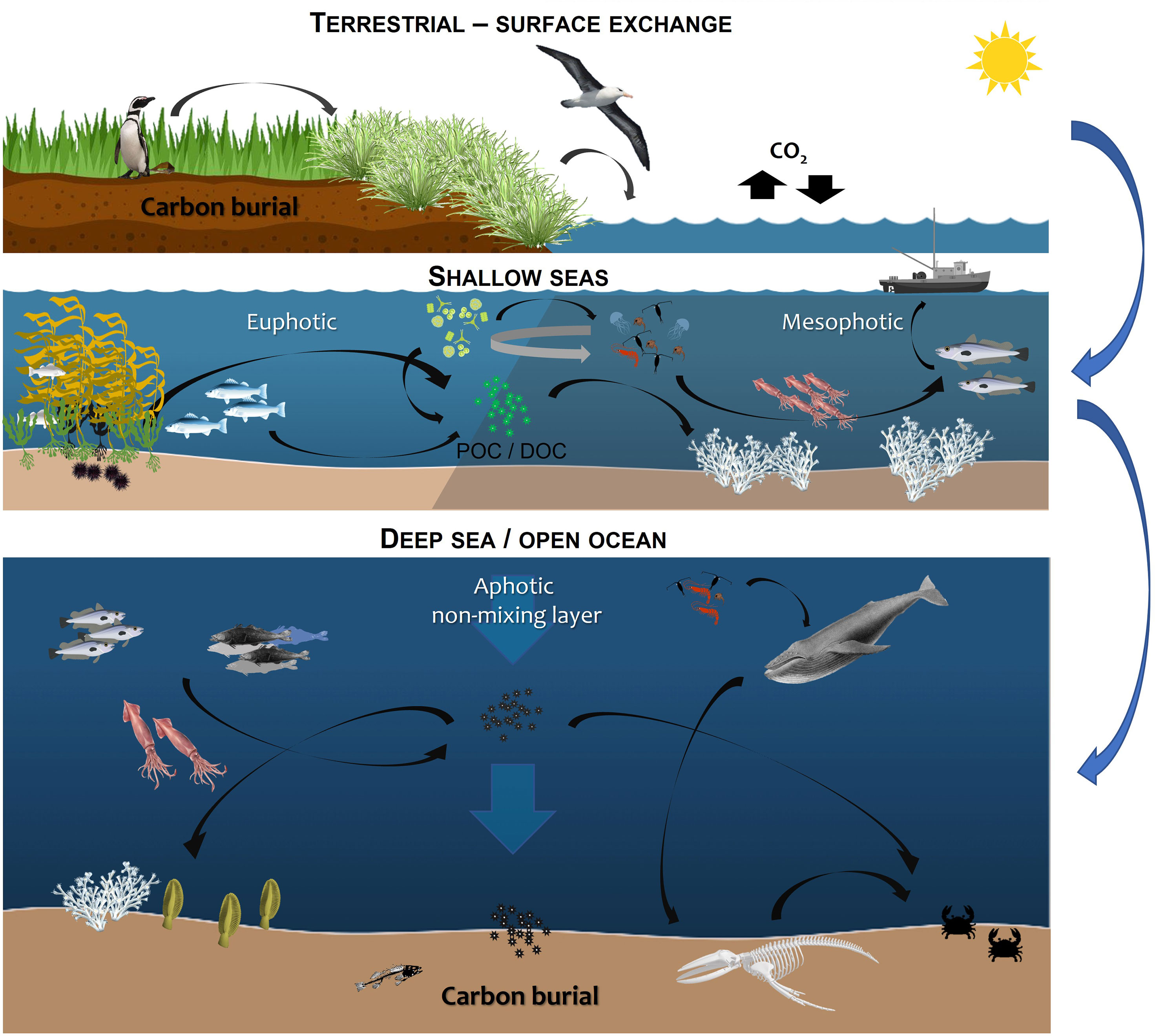 - '''심해 블루카본'''은 국가 관할권을 벗어난 공해의 대륙붕, 심해, 그리고 그 아래 해저에 저장된 탄소를 포함하며, 이는 전체 해양 탄소의 약 90%를 차지한다.[11][12] 그러나 심해 블루카본은 일반적으로 관리가 어렵고 탄소 저장의 영속성에 대한 데이터가 부족하다는 한계가 있다.[2]