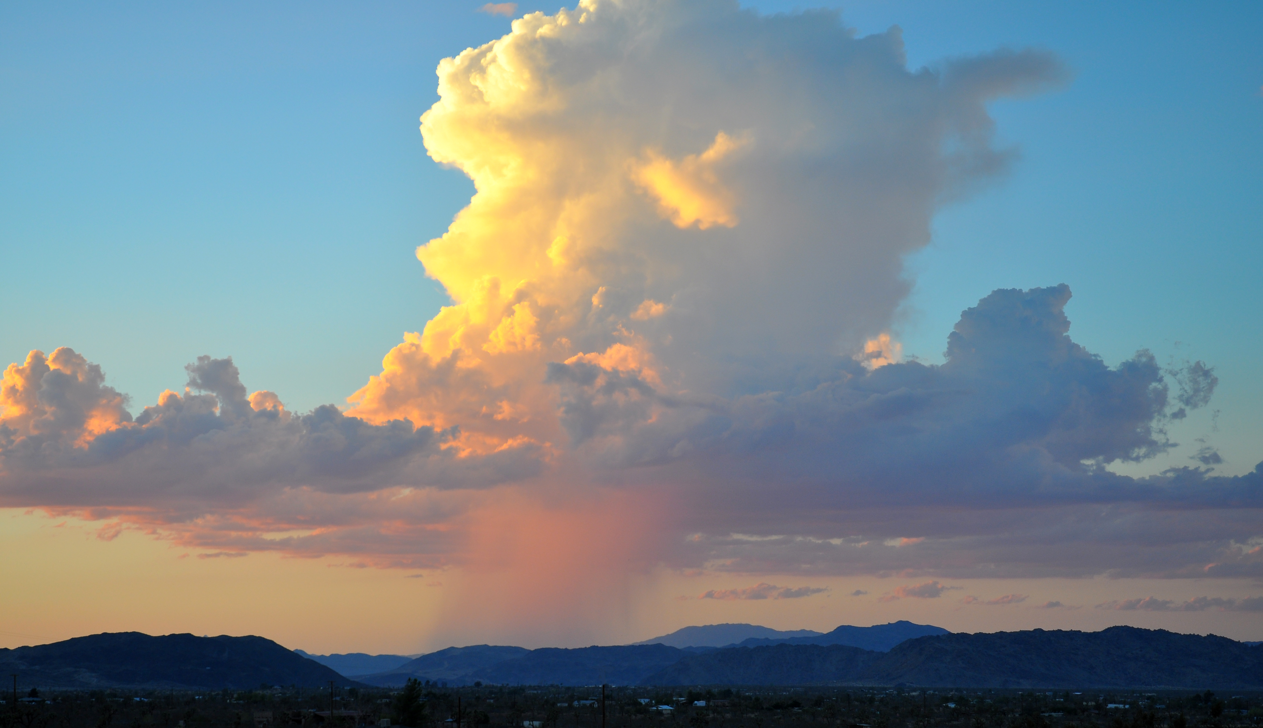 이렇게 충분히 커진 빗방울은 중력에 의해 상승 기류를 이겨내고 지표면으로 낙하하게 된다.[185][186] 때로는 빗방울이 땅에 닿기 전에 증발하여 꼬리 구름(버가) 형태로 보이기도 한다.[188]