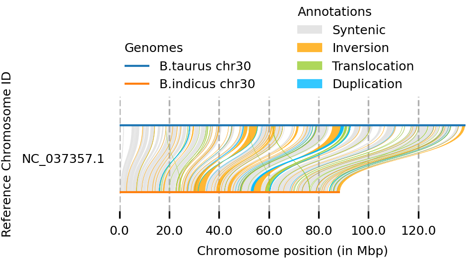 전체 게놈 정렬(Whole-Genome Alignment, WGA)은 둘 이상의 게놈 사이의 뉴클레오티드 수준에서 진화 관계를 예측하는 방법이다.[54] 이는 선형 서열 정렬과 유전자 직교 예측의 요소를 통합하며, 전체 게놈의 방대한 크기와 복잡한 특성으로 인해 더 큰 과제를 제시한다. WGA는 계통 발생 추론, 게놈 주석 및 기능 예측과 같은 다양한 게놈 전체 분석에서 중요한 역할을 한다.[54] SyRI(Synteny and Rearrangement Identifier, 구문론 및 재배열 식별자)는 전체 게놈 조립체 간의 구조적 및 서열 차이를 모두 식별하도록 설계된 도구이다.[55] SyRI는 WGA를 입력으로 받아 게놈 구조의 불일치를 검색하고, 재배열된 영역과 재배열되지 않은(동일한) 영역 내에서 국소 서열 변이를 식별한다.[55]
