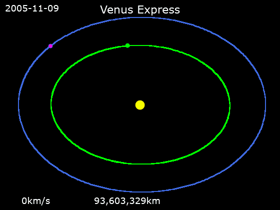 2005년 11월 11일, 첫 번째 궤도 수정 기동이 성공적으로 수행되었다.[7] 2006년 4월 11일 금성에 도착하여 07:10:29에서 08:00:42 협정 세계시 SCET 사이에 주 엔진을 점화하여 속도를 줄여 금성의 중력에 의해 400by의 9일 궤도로 포획될 수 있었다.[8] 이 연소는 독일 다름슈타트에 있는 ESA의 통제 센터인 ESOC에서 모니터링되었다.''비너스 익스프레스''가 금성 주위의 최종 작동 24시간 궤도에 도달하기 위해 주 엔진을 이용한 두 번과 로켓 엔진을 이용한 다섯 번의 총 7번의 추가 궤도 제어 기동이 필요했다.[8]