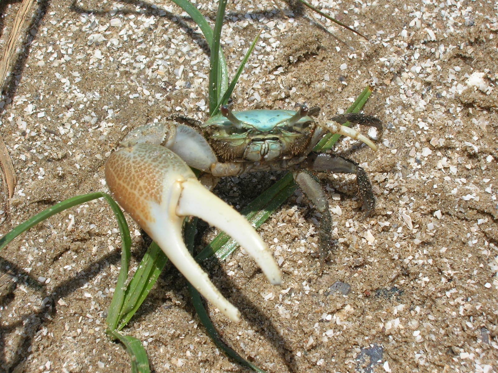 - 수컷 칠게는 큰 집게발 하나와 작은 집게발 하나를 가지고 있습니다.[5]