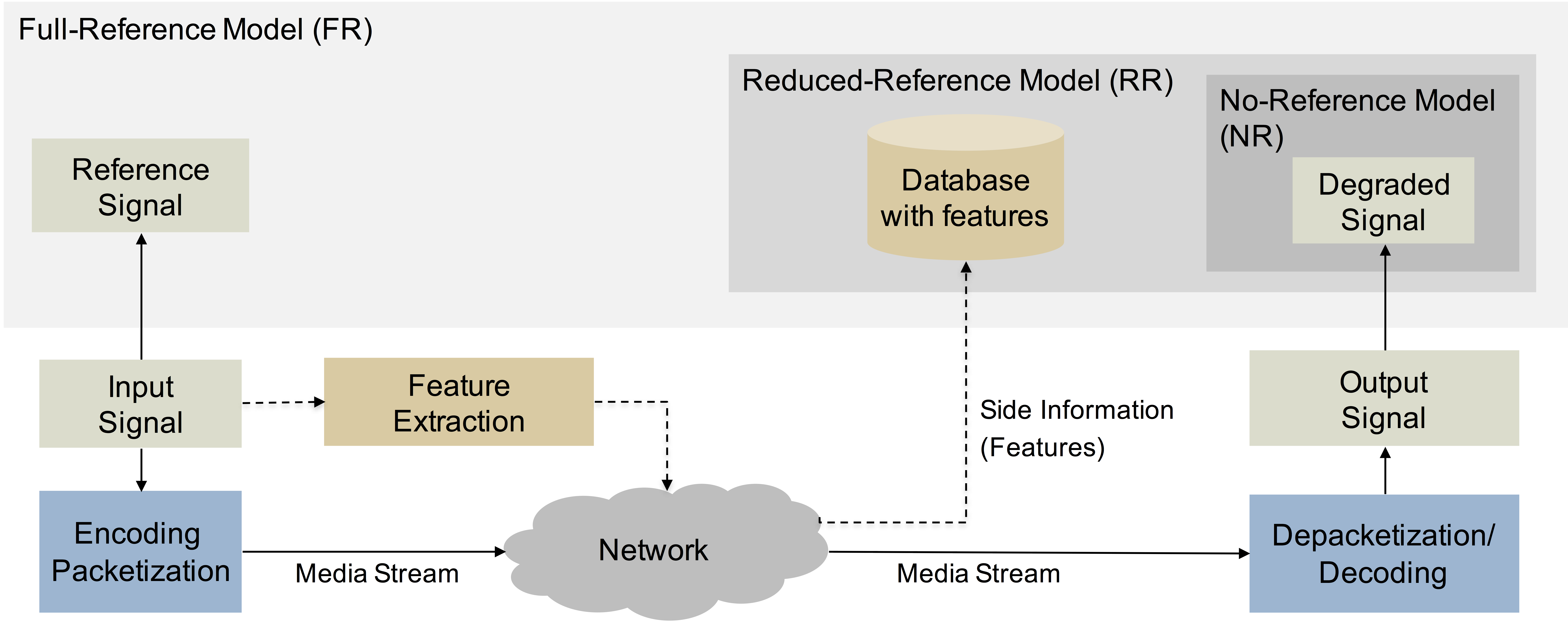 객관적 모델은 원본 신호와 수신된 신호에 대한 정보량에 따라 전체 참조(FR), 축소 참조(RR), 무참조(NR) 방법으로 분류할 수 있다.[5]