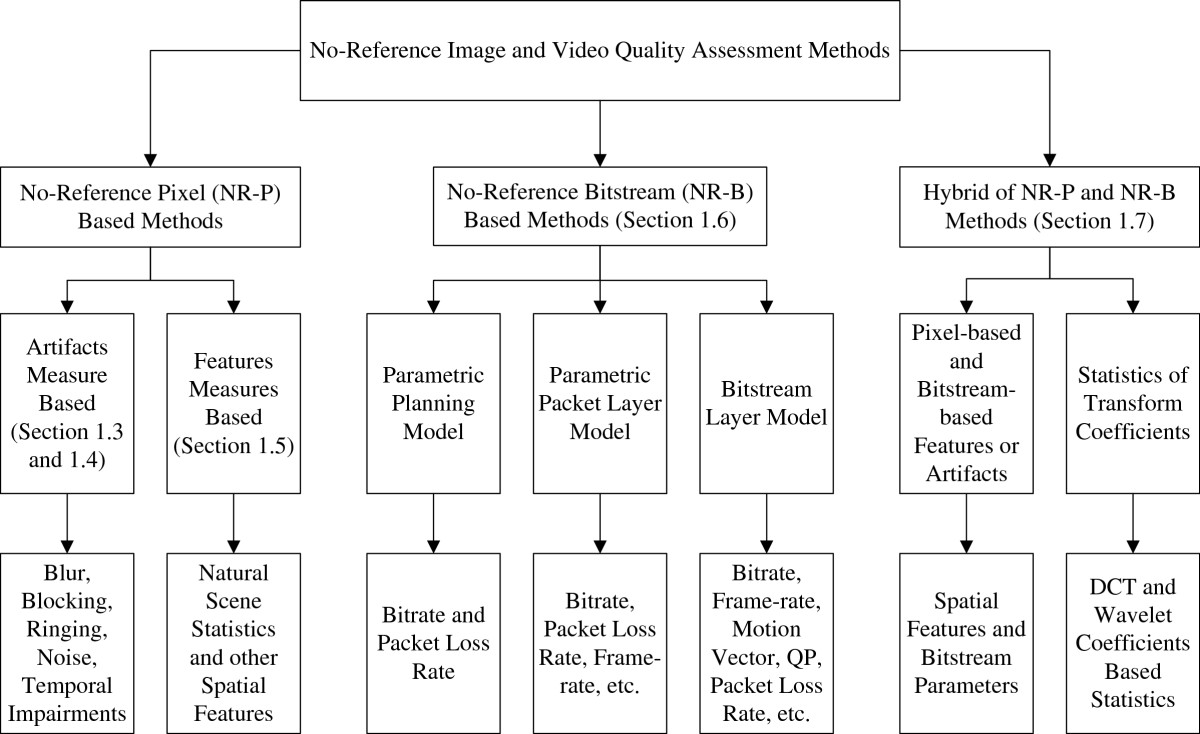 • '''픽셀 기반 방법 (NR-P):''' 신호의 디코딩된 표현을 사용하여 픽셀 정보를 기반으로 품질을 분석한다.