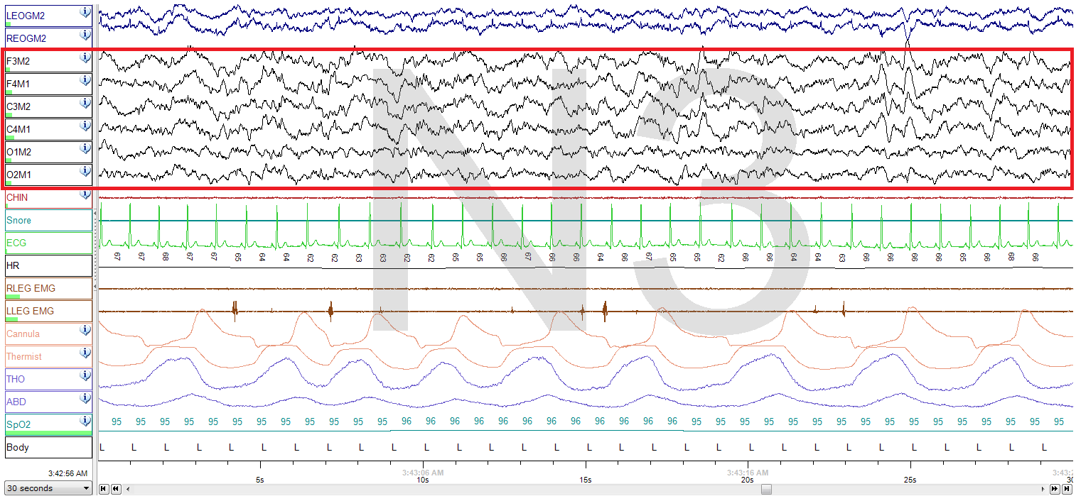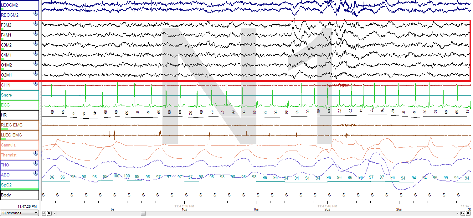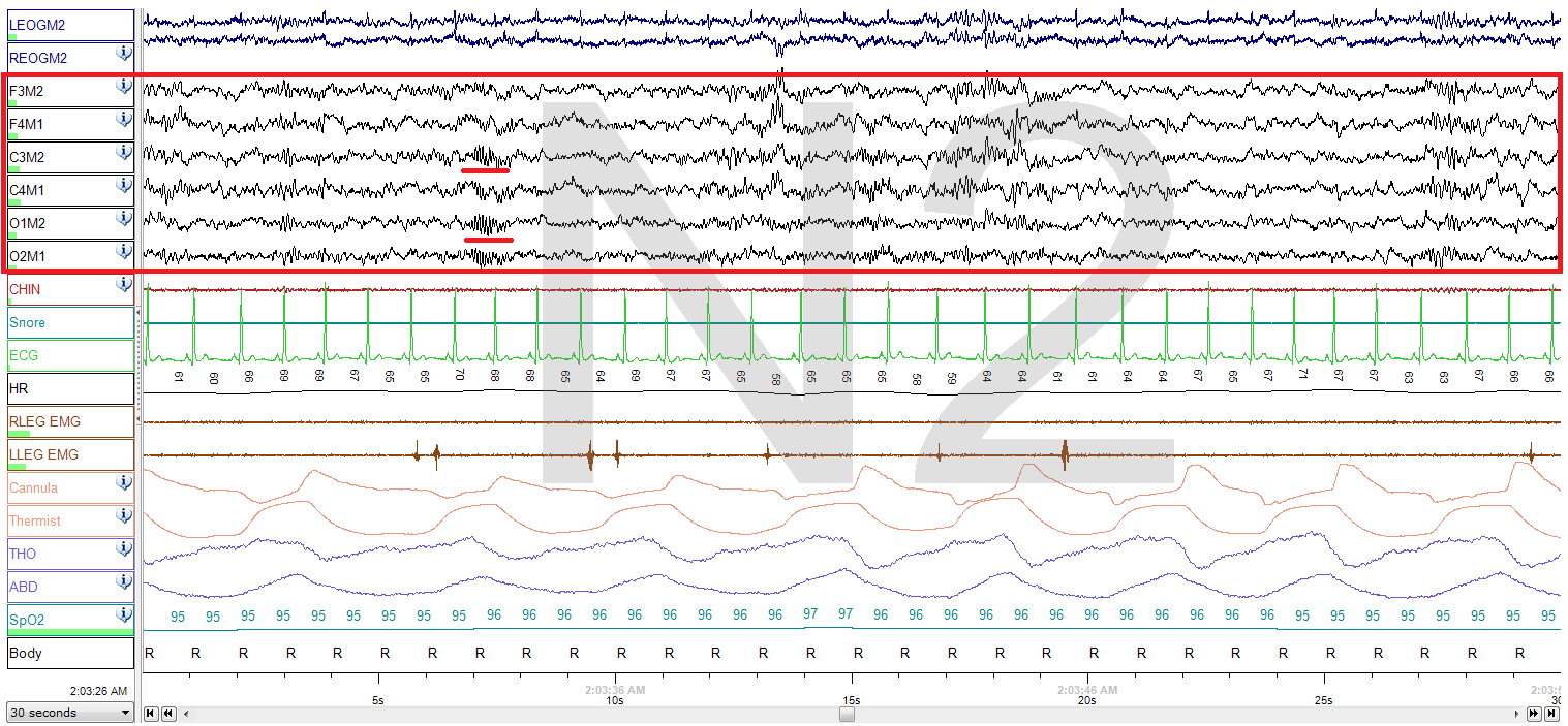 다음은 비렘수면 1, 2, 3단계의 30초 간격(30초의 데이터)을 나타낸 이미지이다. 각 그림은 양쪽 눈, 뇌파(EEG), 턱, 마이크, 심전도, 다리, 코/입 공기 흐름, 써미스터, 흉부 노력, 복부 노력, 산소 측정법, 그리고 신체 위치의 데이터를 순서대로 나타낸다. 2단계 그림의 수면 방추는 빨간색으로 밑줄이 쳐져 있다.