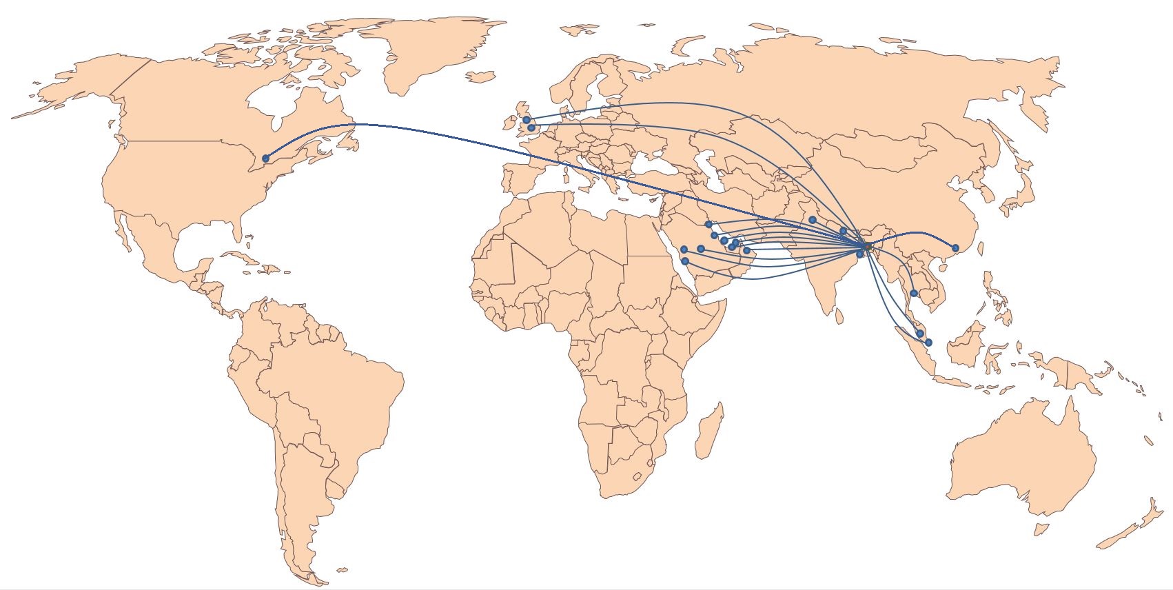 노선망은 남아시아, 서아시아(중동)를 중심으로 런던, 로마에 취항하고 있다. 과거에는 뉴욕, 프랑크푸르트 등 장거리 노선도 운항했지만, 축소되었다. 그러나 보잉 777 도입 이후 다시 노선망을 넓혀가고 있다.