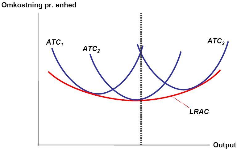 장기 평균 비용 (LRATC/LRAC) 곡선은 단기 곡선과 비슷하지만, 물리적 자본의 사용을 변경할 수 있다는 점이 다르다. 각 생산량에 대해 자본의 비용을 최소화하는 수준이 하나씩 있으며, 주어진 생산량을 생산하는 것과 관련된 고유한 단기 평균 비용 곡선이 존재한다.[12] 만약 기업이 생산량에 맞는 최적의 자본 수준을 사용하고 있지 않다면, SRAC 곡선은 LRAC 위에 놓이게 되며 어떤 점에서도 접하지 않는다.