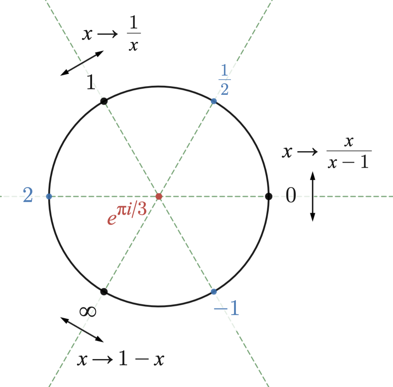 이러한 궤도는 세 가지가 있는데, 궤도 \(\{-1, 1/2, 2\}\)는 조화비라고 불리며, 이는 차수가 2인 원소 \(\lambda\mapsto1/\lambda\), \(\lambda\mapsto1-\lambda\), \(\lambda\mapsto\lambda/(1-\lambda)\)에 대응한다. 복소수체에서는 궤도 \(\{\exp(\pm\pi i/3)\}\)가 존재하며, 이는 차수가 3인 원소 \(\lambda\mapsto1/(1-\lambda)\) 및 \(\lambda\mapsto(\lambda-1)/\lambda\)에 대응한다.