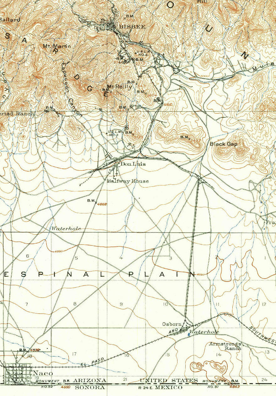 비스비는 구리, 금, 은 광산 도시로 설립되었다; 1902년 지형도